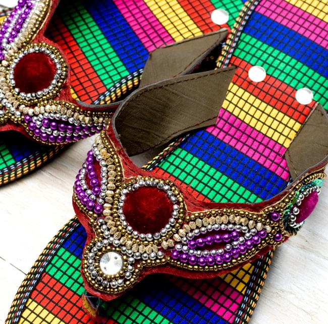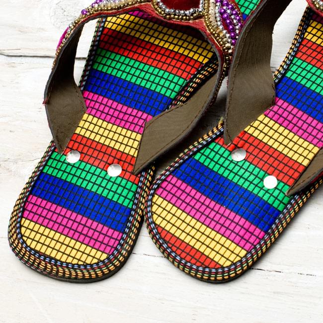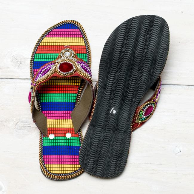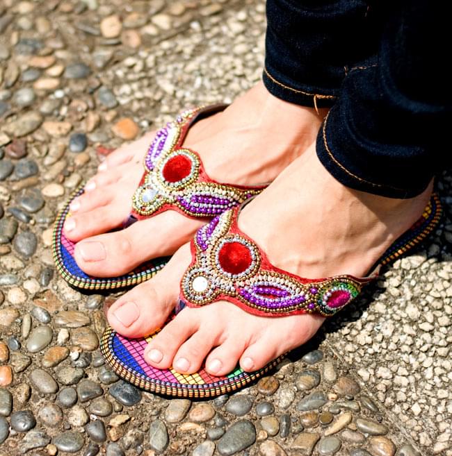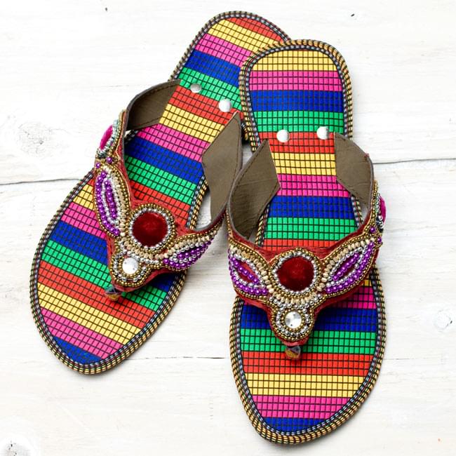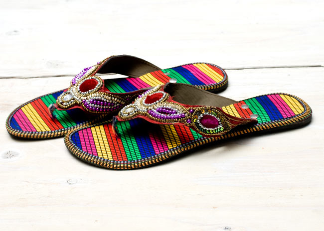 「チャッパル」と呼ばれるまさにインド!という華やかなサンダルがやって来ました。ビーズやスパンコールがキラキラと輝き、ところ狭しと刺繍が施されています。このサンダルでパンジャビドレスやサリーを合わせたら、コーディネートは完璧だね!というインドスタイルです。どちらも微妙にデザインが異なりますが、どれが良いか迷ってしまうくらいバランスの取れた配色にうっとりします。インドの女性って本当に華やかなデザインが好きなんだな〜と改めて実感する一品です。エスニックファッションだけでなく、シンプルにデニムやTシャツに合わせてもかっこよく決まりますよ!■現地のインド人女性向けの商品です