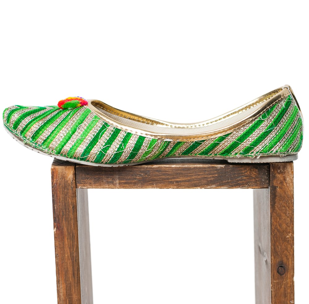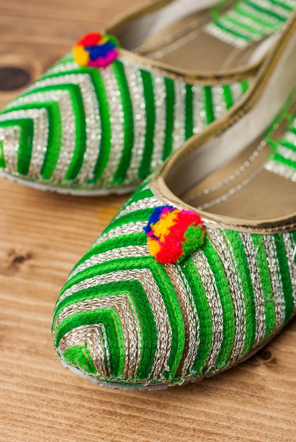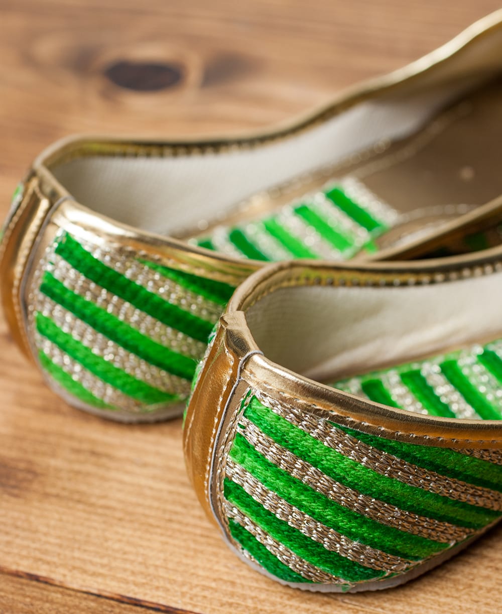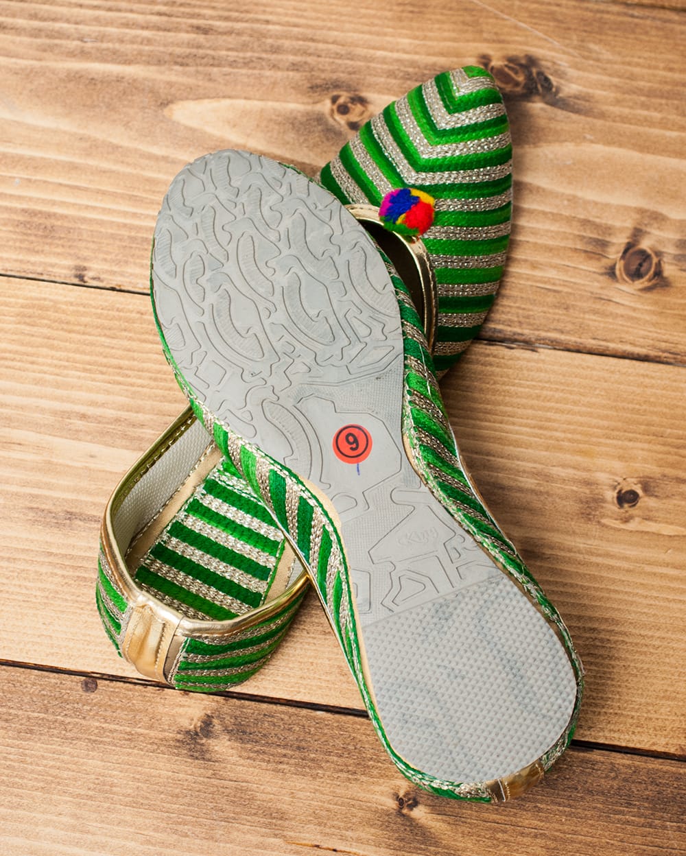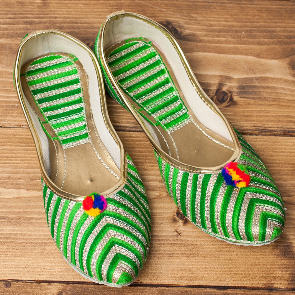色とりどりのサリーが舞う国インドから華やかなフラットシューズがやって来ました。ビーズやスパンコールがキラキラと輝き、ところ狭しと刺繍が施されています。このシューズでパンジャビドレスやサリーを合わせたら、コーディネートは完璧だね!というインドスタイルです。どれも微妙にデザインが異なりますが、どれが良いか迷ってしまうくらいバランスの取れた配色にうっとりします。インドの女性って本当に華やかなデザインが好きなんだな?と改めて実感する一品です。エスニックファッションだけでなく、シンプルにデニムやTシャツに合わせてもかっこよく決まりますよ!