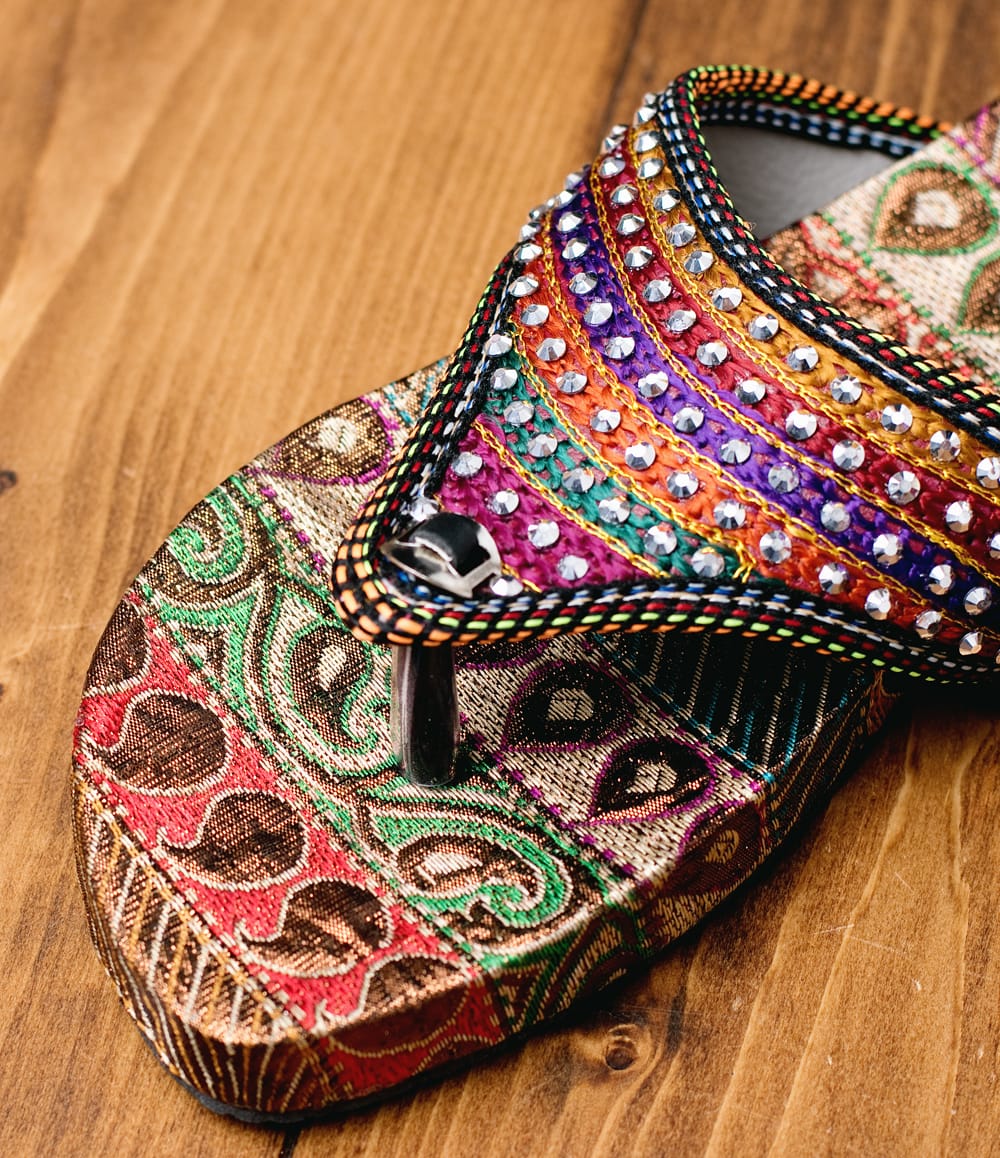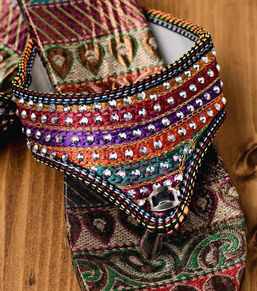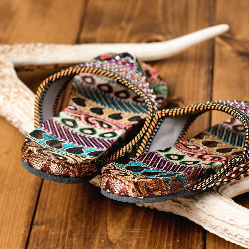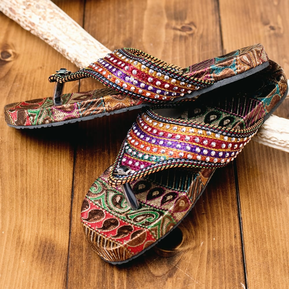 まさにインド!という華やかなビーチサンダルがやって来ました。スパンコールなどがキラキラと輝き、ところ狭しとカラフルな刺繍が施されています。インドの女性って本当に華やかなデザインが好きなんだな?と改めて実感する一品です。エスニックファッションだけでなく、シンプルにデニムやTシャツに合わせてもかっこよく決まりますよ!■現地のインド人女性向けの商品です