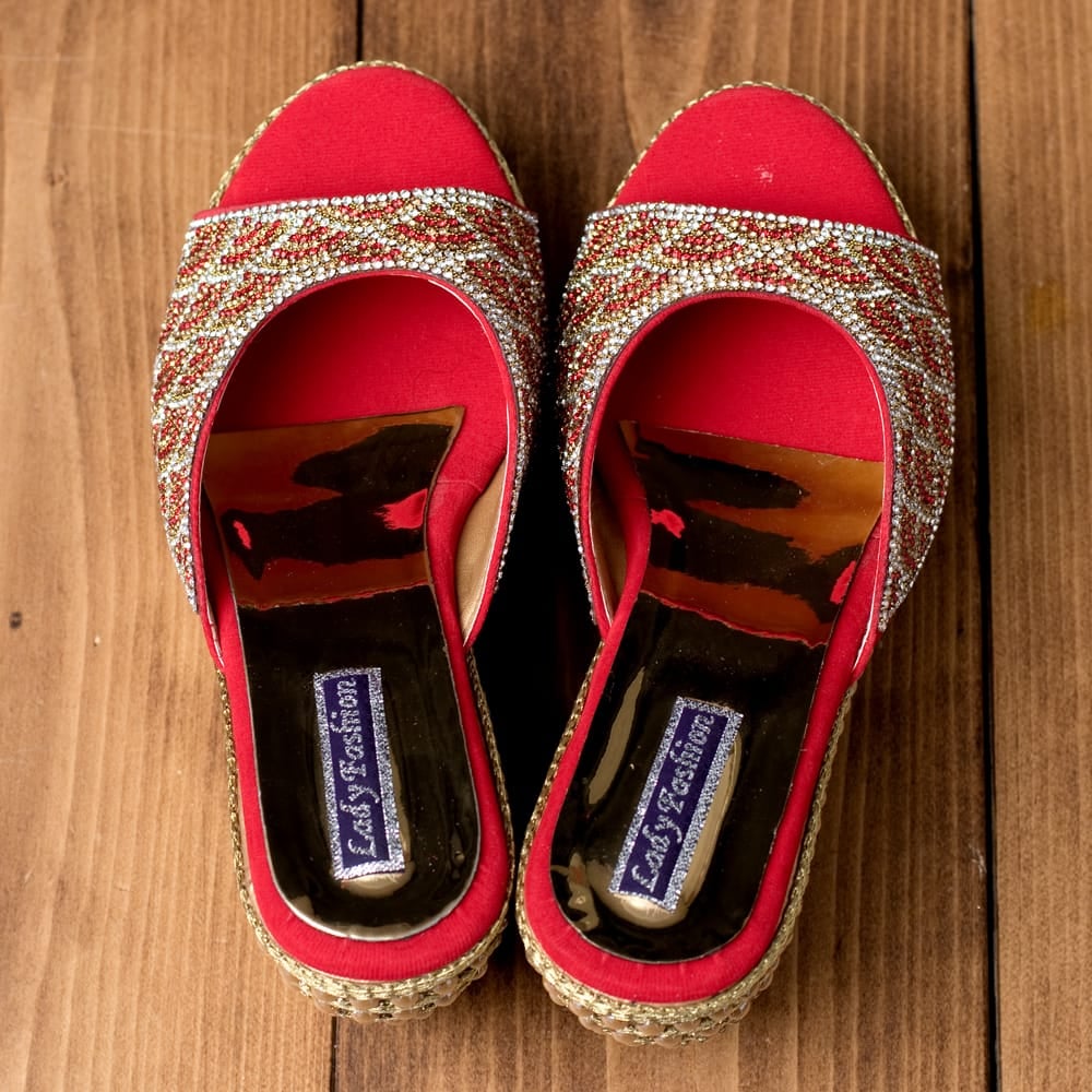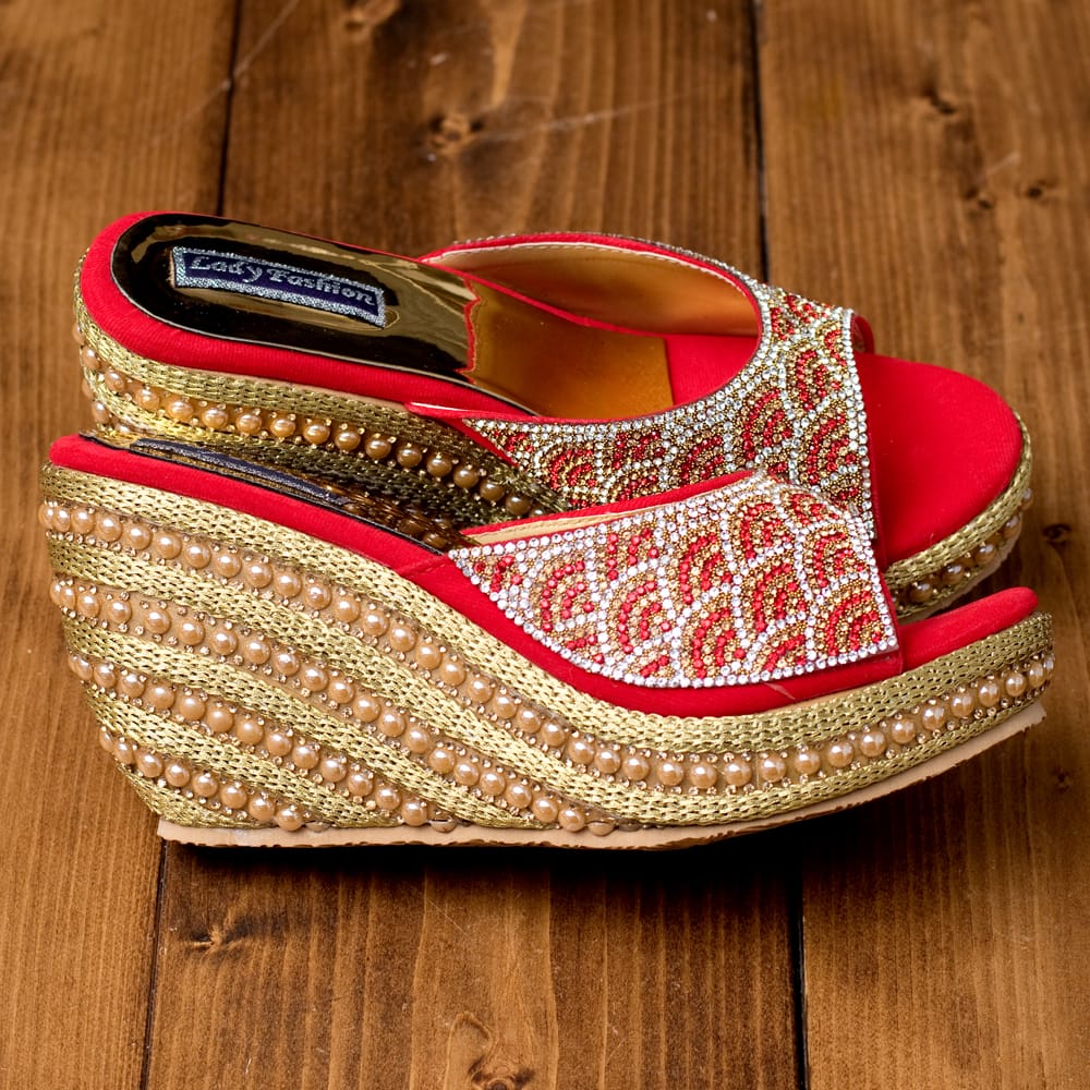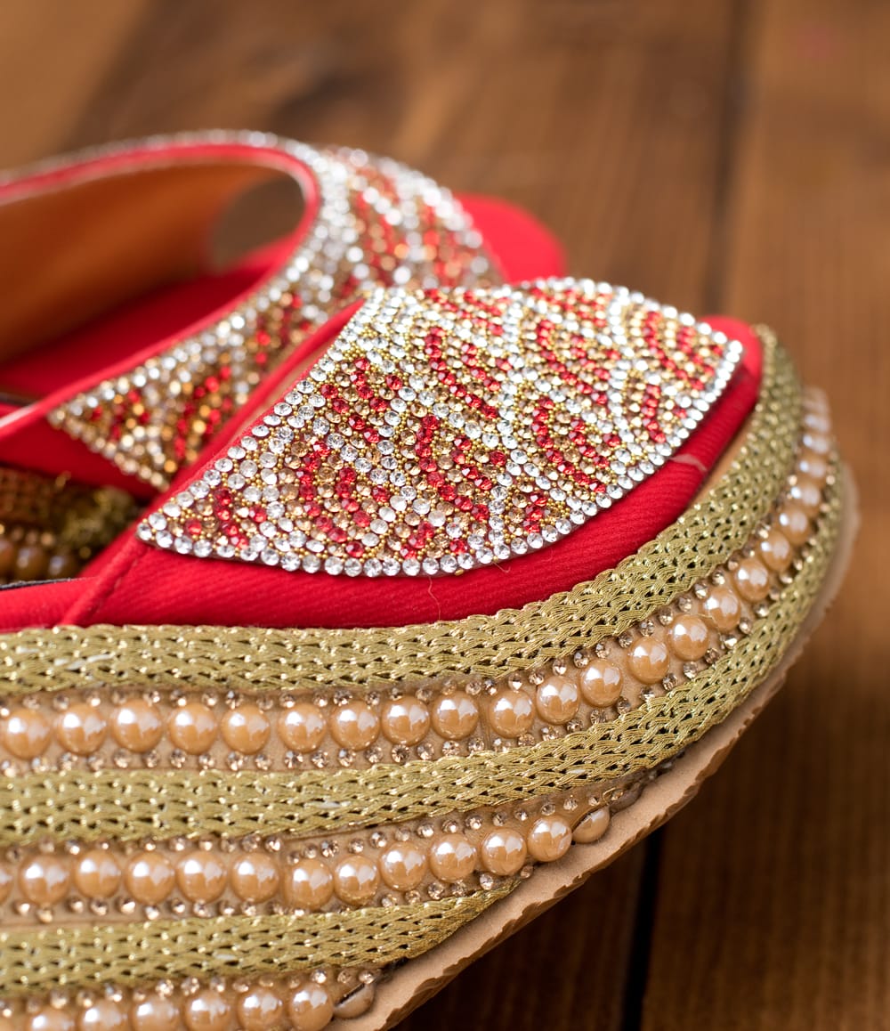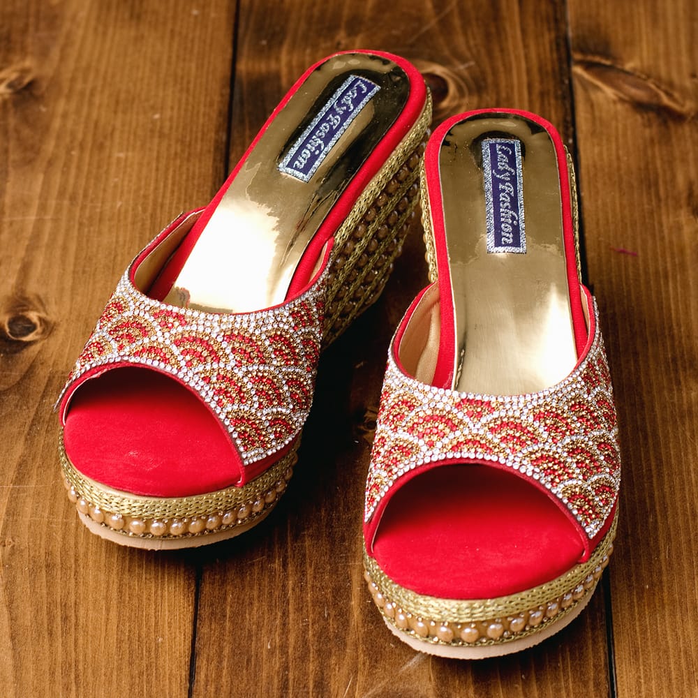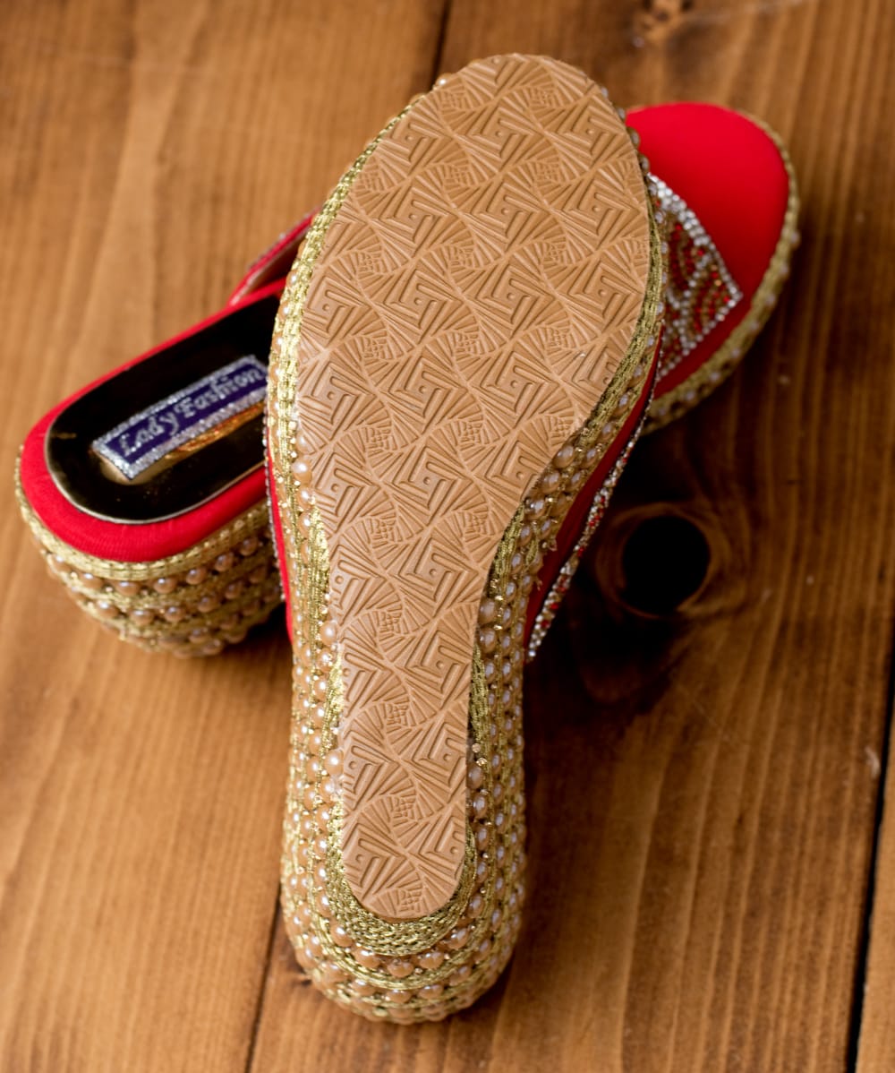 まさにインド!という華やかなサンダルがやって来ました。ウェッジソールで脚長効果もあり、普通のヒールより履きやすく安定していて歩きやすい!横から見た時のシルエットも綺麗です。靴にはところ狭しと華やかなラインストーン施され、キラキラと輝き足元が華やかになります。インドの女性って本当に華やかなデザインが好きなんだな?と改めて実感する一品です。エスニックファッションだけでなく、シンプルにデニムやTシャツに合わせてもかっこよく決まりますよ!