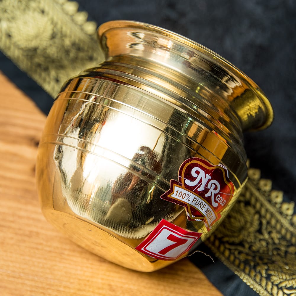 インドで礼拝を行う時にガンジス河の水を入れたり、神様への捧げ物の容器として主に使用される水差しです。銅製のものよりも軽いので使いやすく、綺麗な金色なのでいろんな用途で使えます。