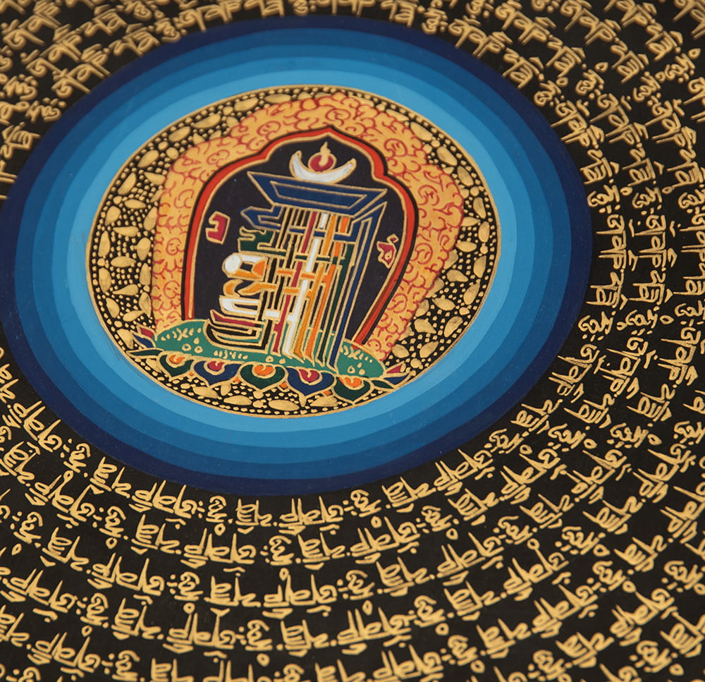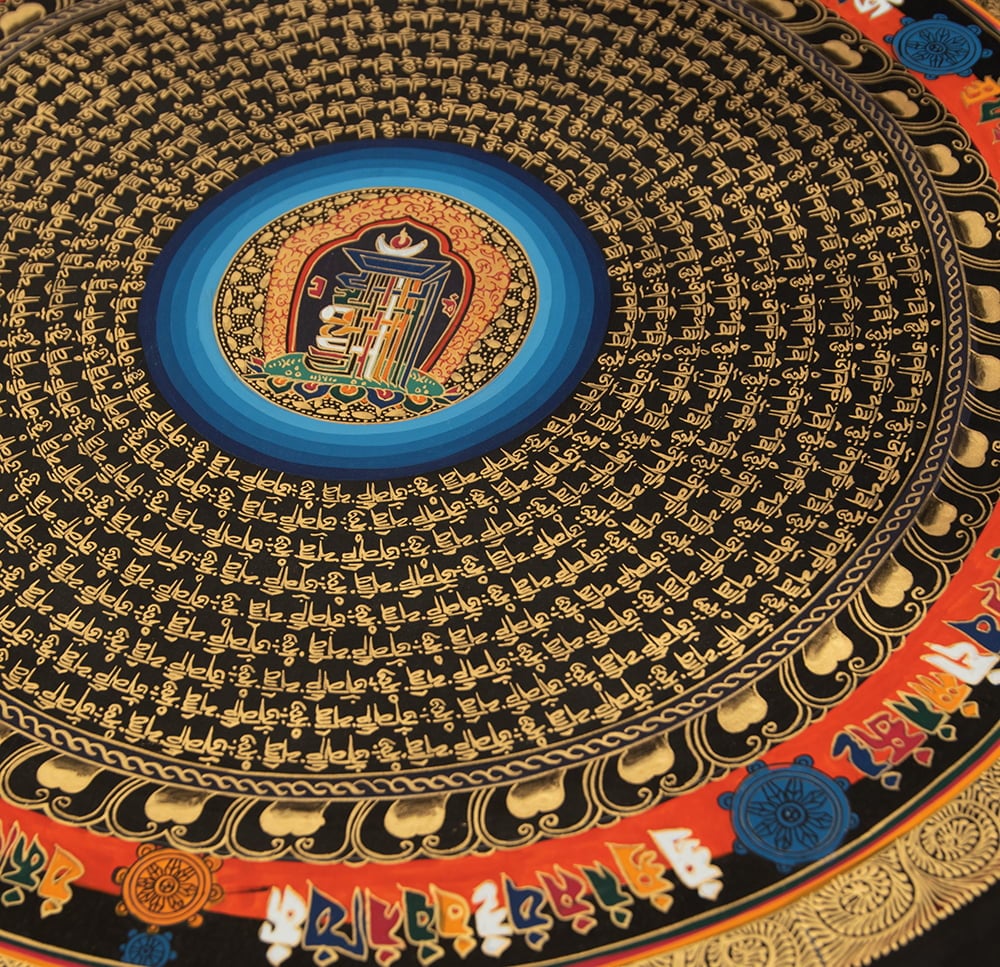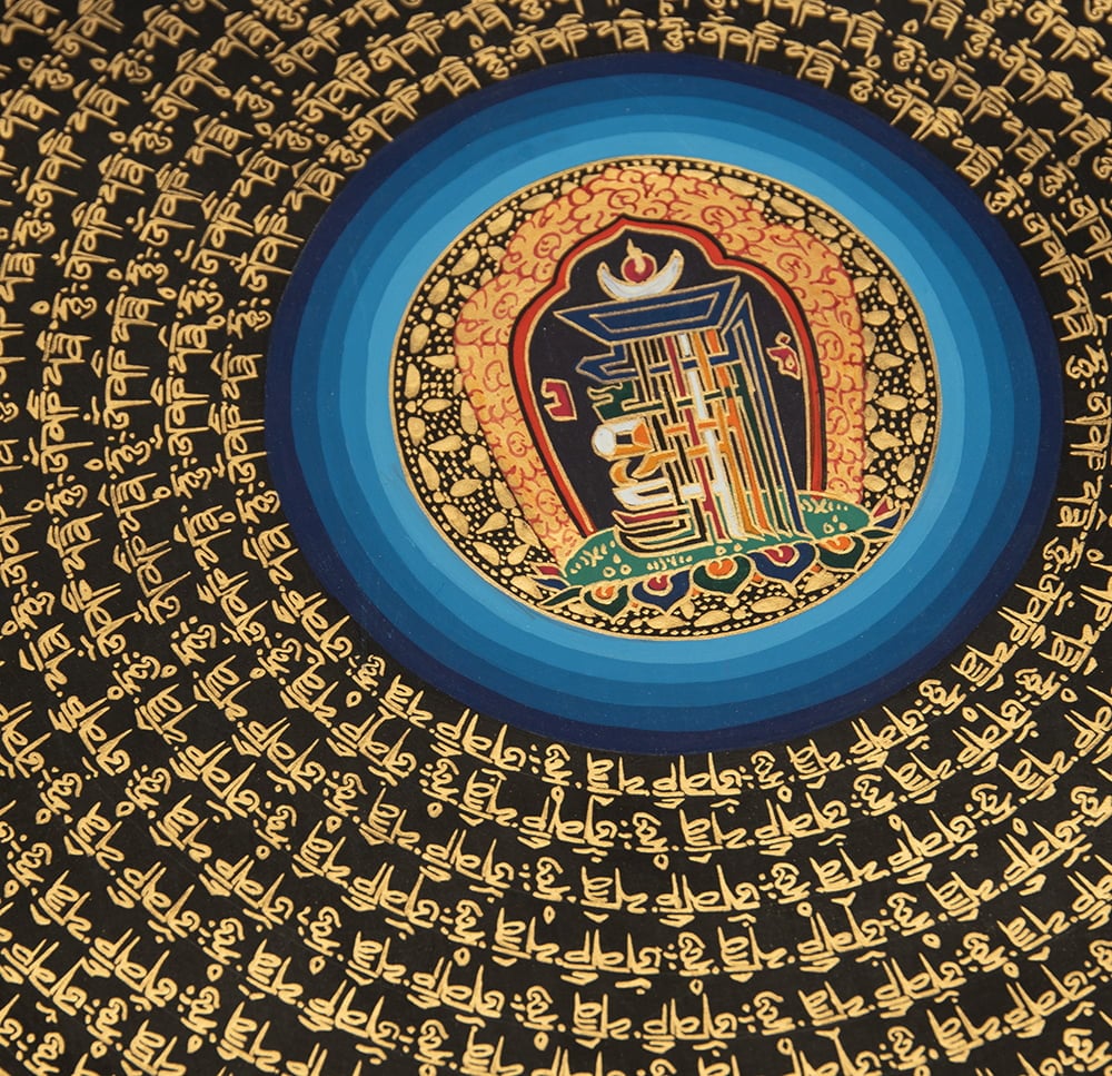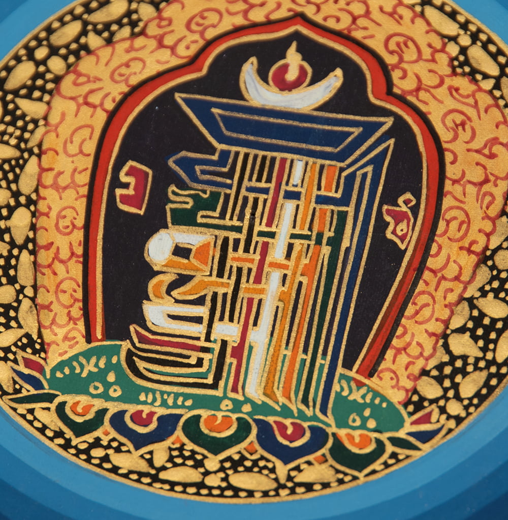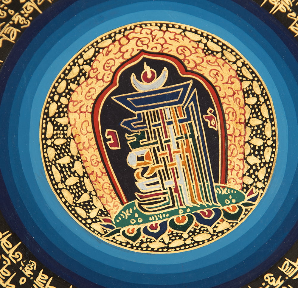 文字が複雑に入り組んだこの図形は、チベット文化圏で非常に重用される「カーラチャクラのシンボル」と呼ばれるものです。この図形は時間と空間の教えであるカーラ チャクラ タントラを表現しているとされています。我々の存在は時間と空間の中にありますが、私達の精神世界はどこから来てどこに行き、そしてどこに繋がっているのでしょうか。人類の永遠の疑問とも言うべきその問題に対し、古来からの賢人たちが一定の答えを見出したのが、カーラチャクラ タントラなのです。