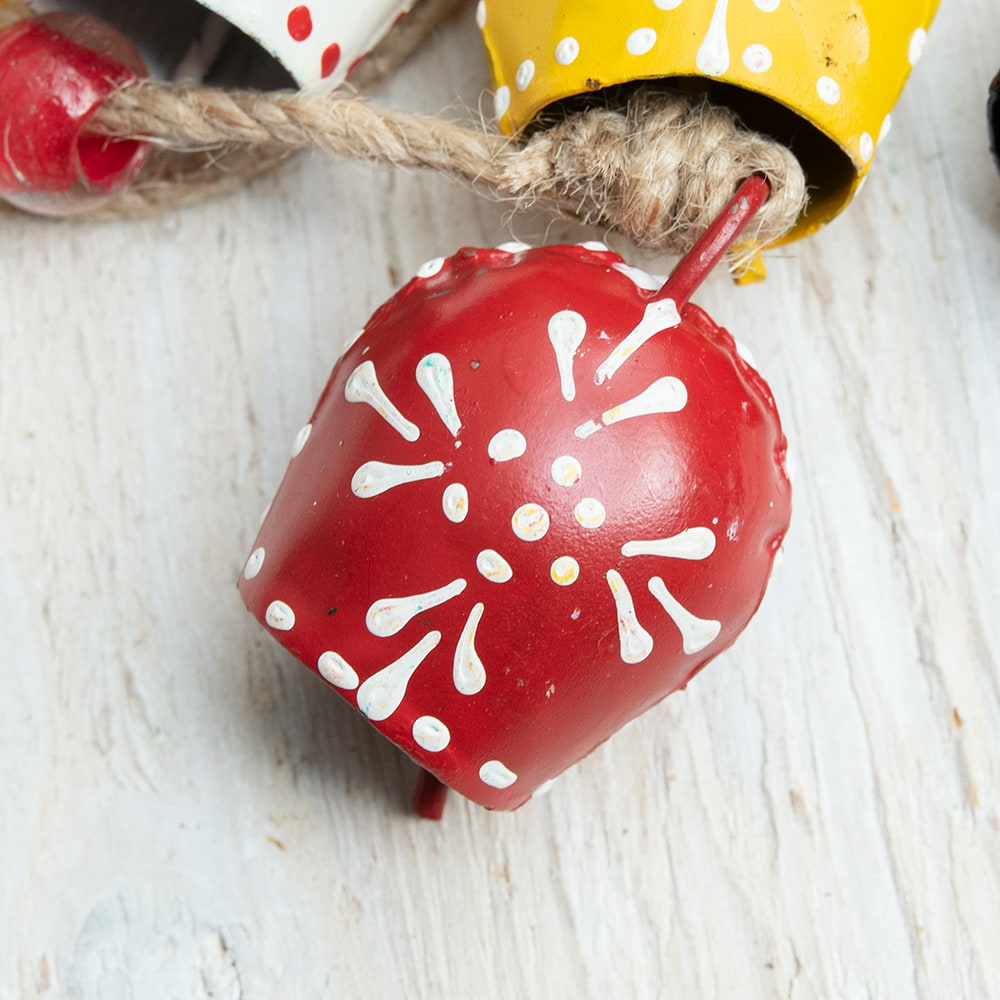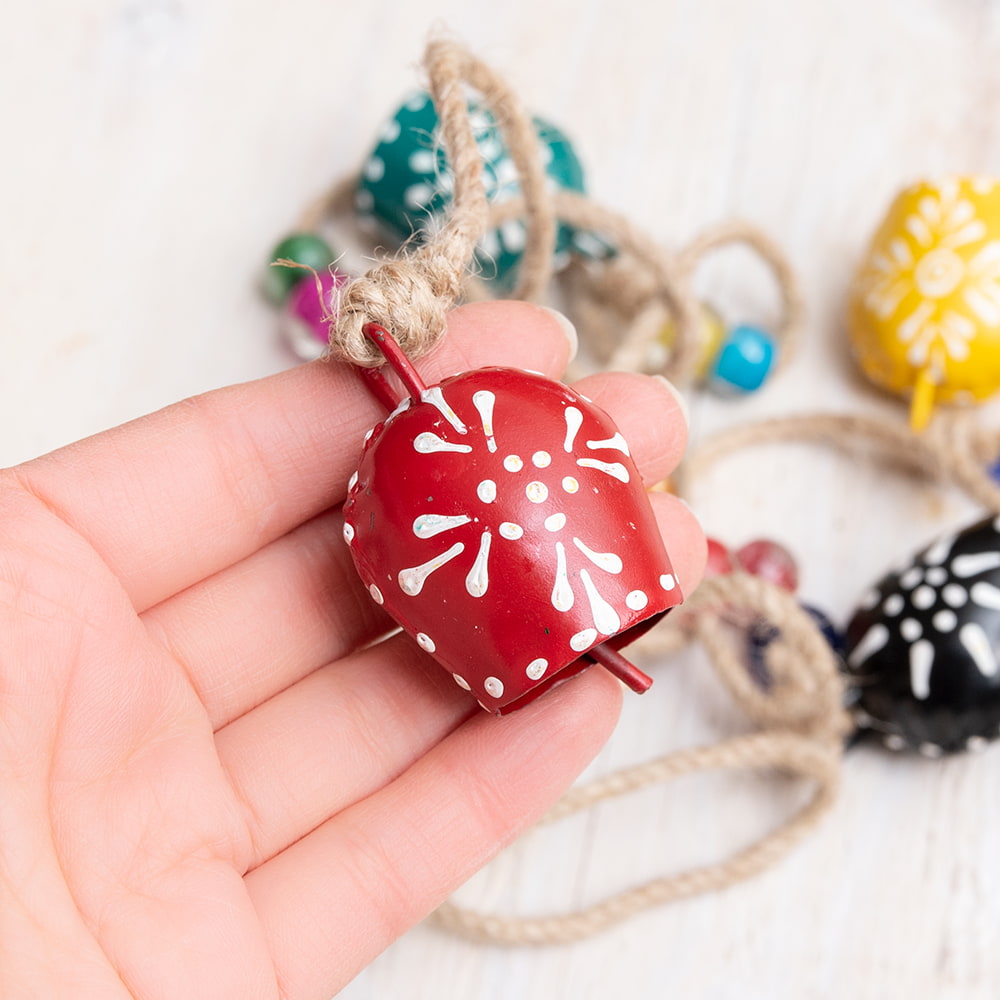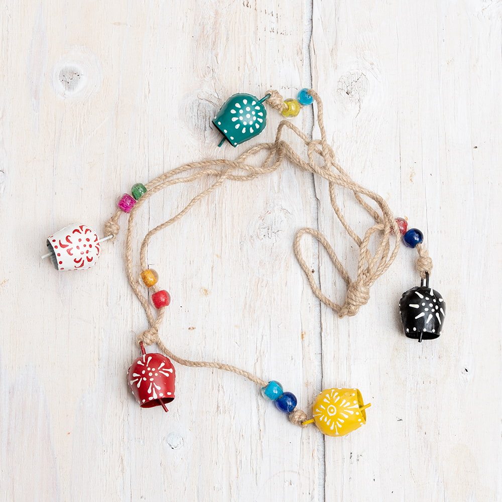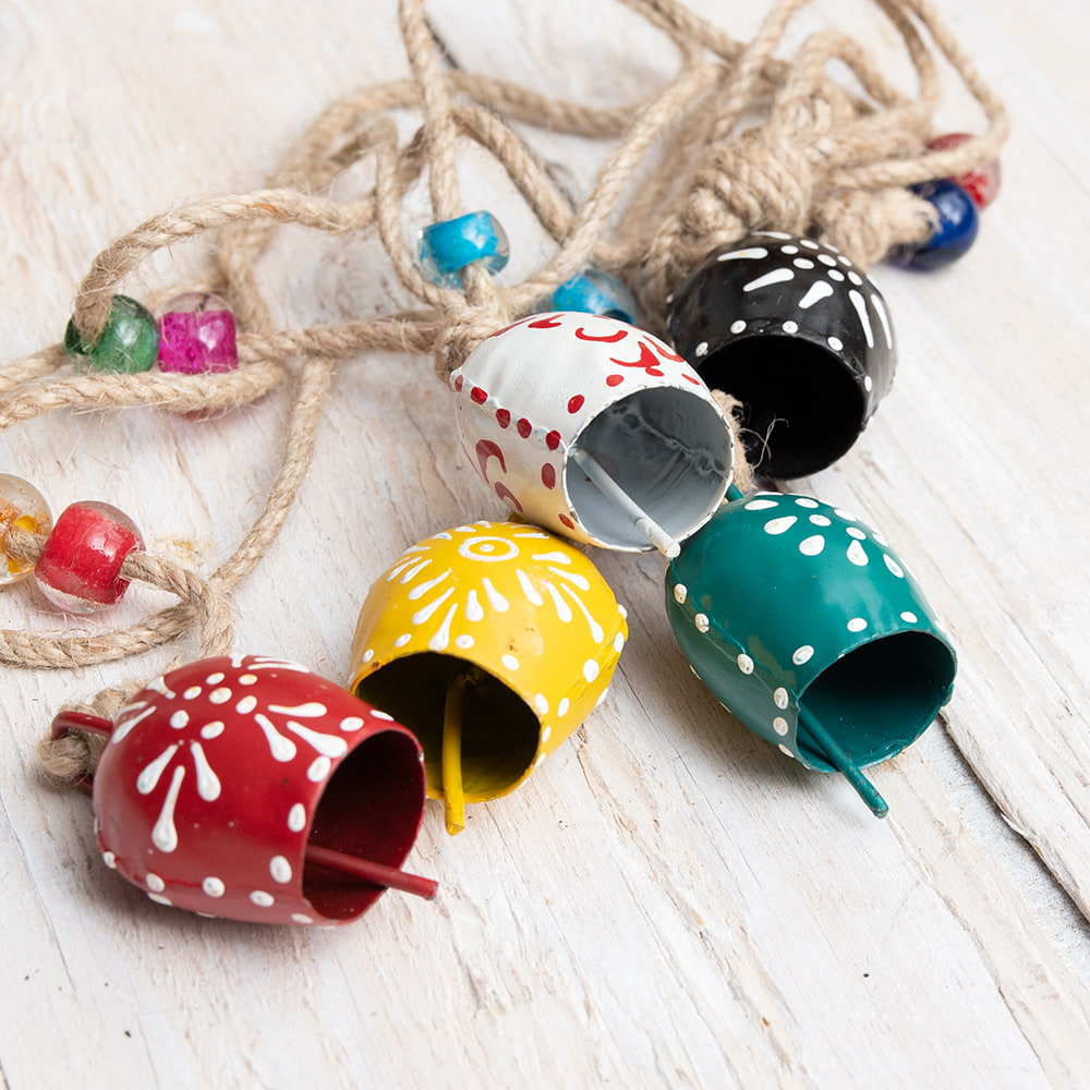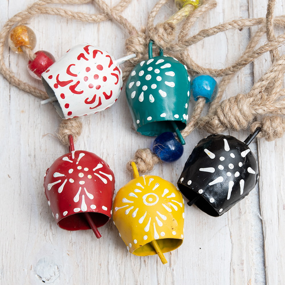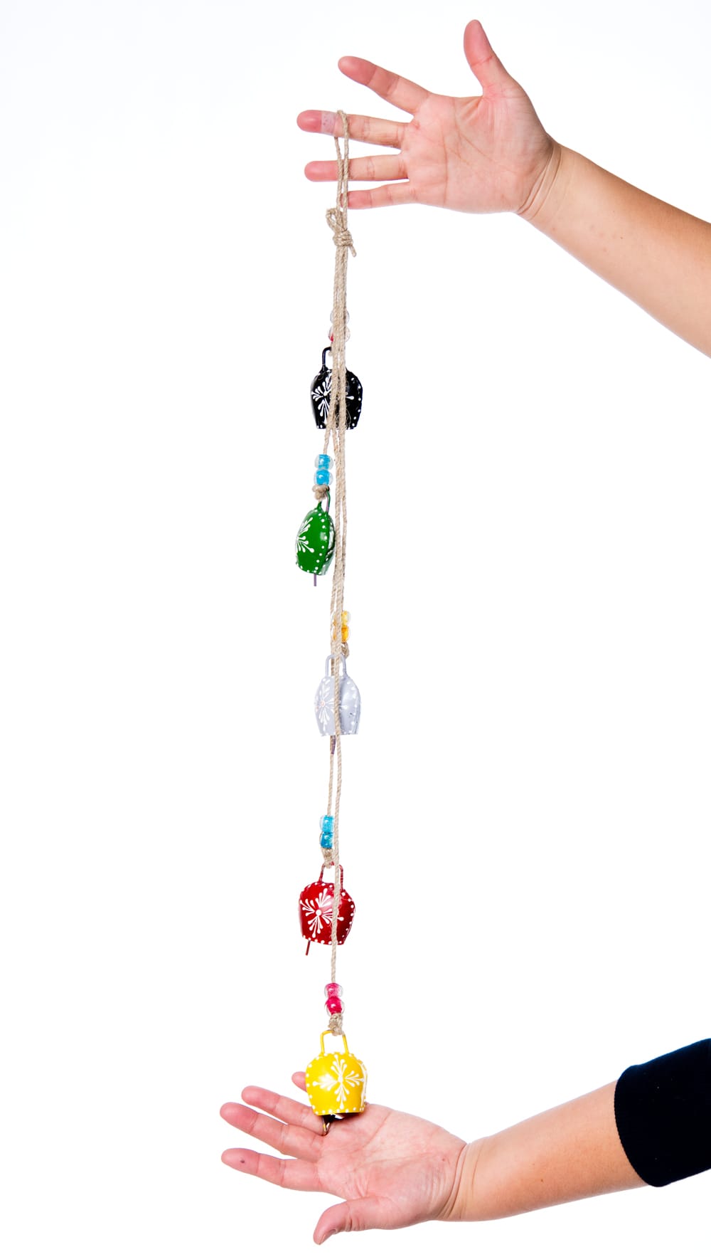 【送料無料・4個セット】ドアチャイムなどへ!手作りのやさしい音色 インドの銅製カウベル ハンギング - カラフル5連ベル〔約70cm〕