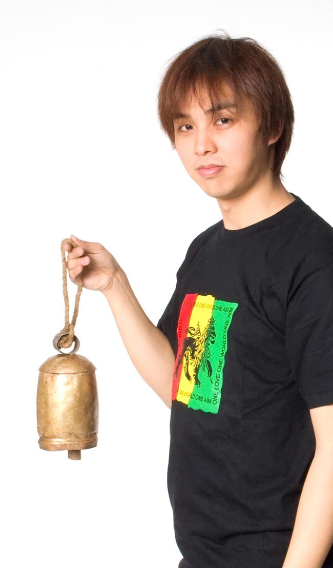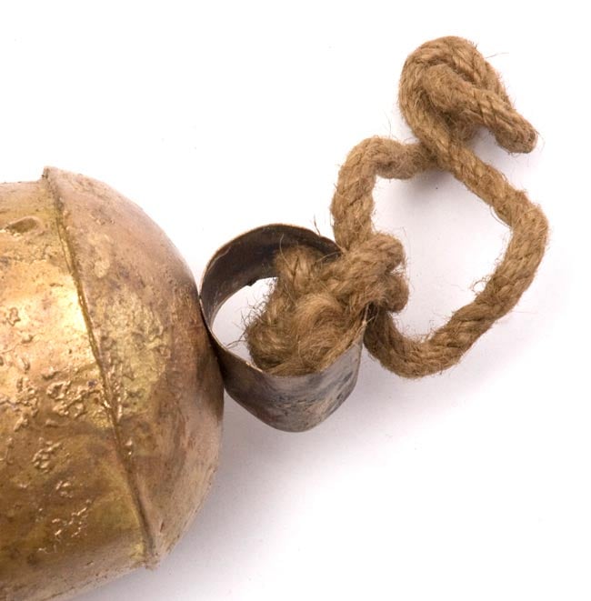 このベルは、振り子が木製で作られております。金属製だと少し強めの音になりますが、木製だと響きがとても優しいです。遠くインドの田舎にいるような気分になってくる、落ち着く音色が響きます。ベルの振り子を囲むパーツ、そして上部の蓋になる部分。その他すべてのパーツを主にハンマーを使って叩き、組み合わせることで作られています。