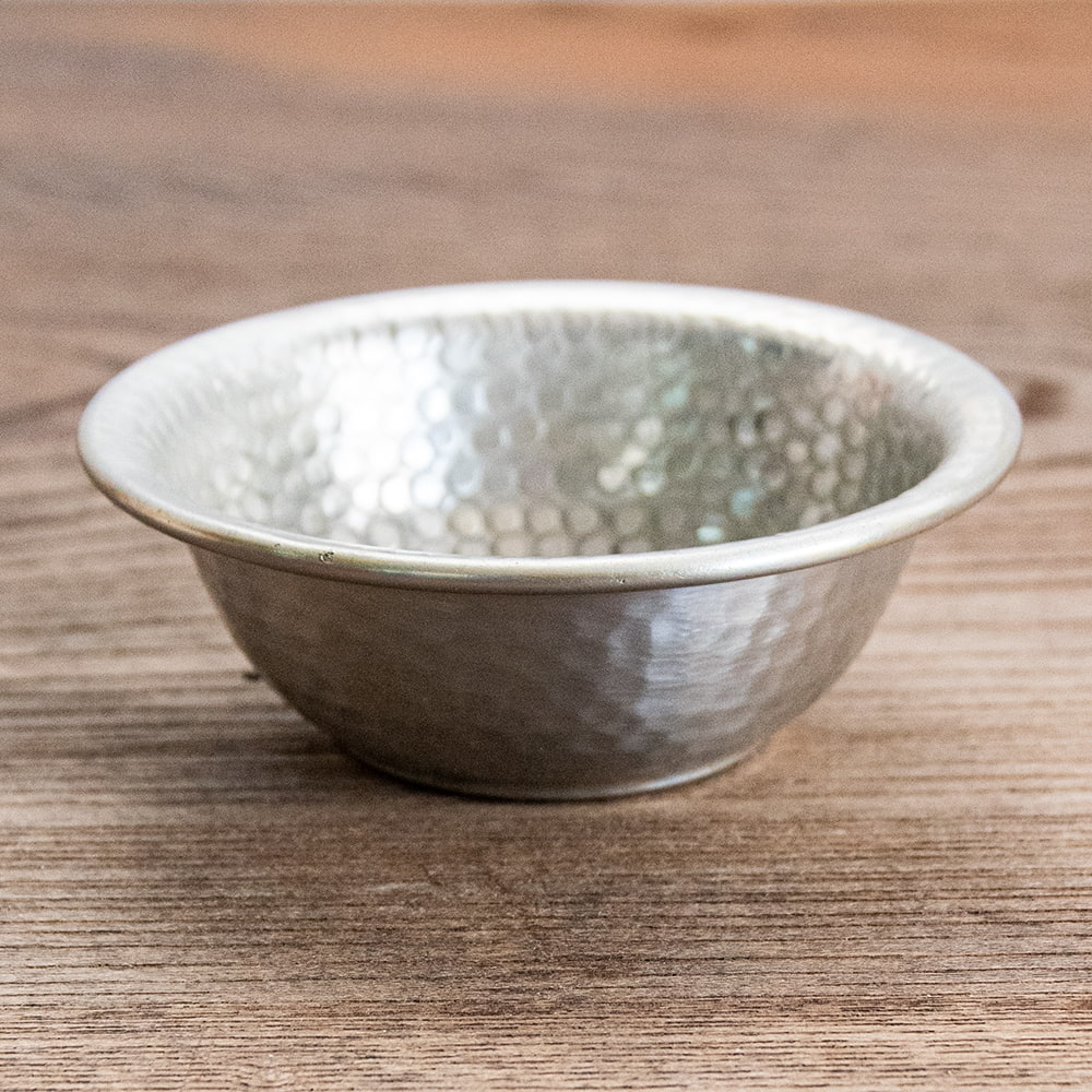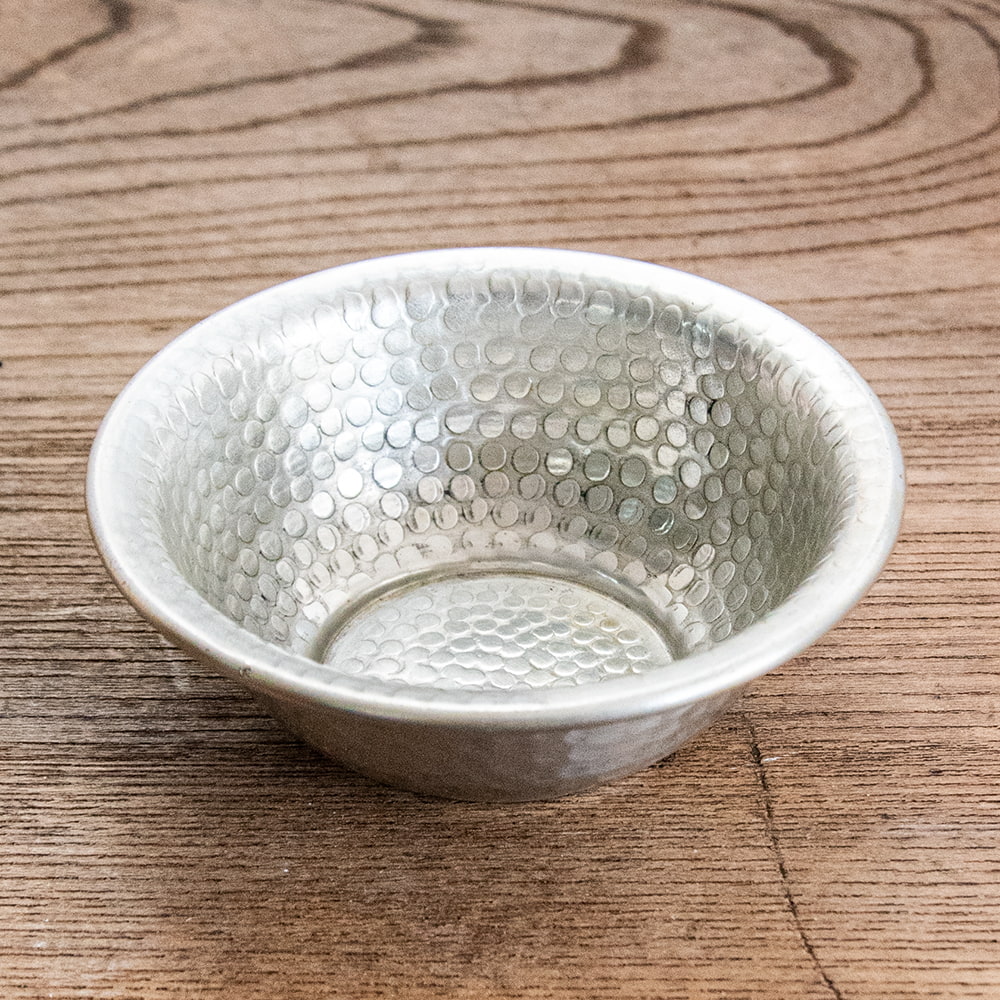 デリーから6時間ほど離れたところにあるイスラム街モラダバードから、手仕事の光る上品なアルミ製のミニボウルが届きました。アンティーク感のあるボウルは鈍く光る金属の質感と相まってテーブルまわりを美しく飾ってくれます。職人による手仕事のため、一つ一つが微妙に異なった仕上がりになっています。ハンドメイドならではのデザインのゆらぎが生き生きとした質感を感じさせます。使い込むにつれて風合いが増していきますので、長く楽しむのにおすすめの一品です。