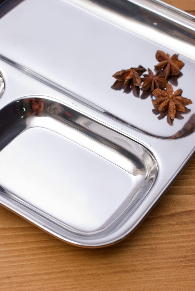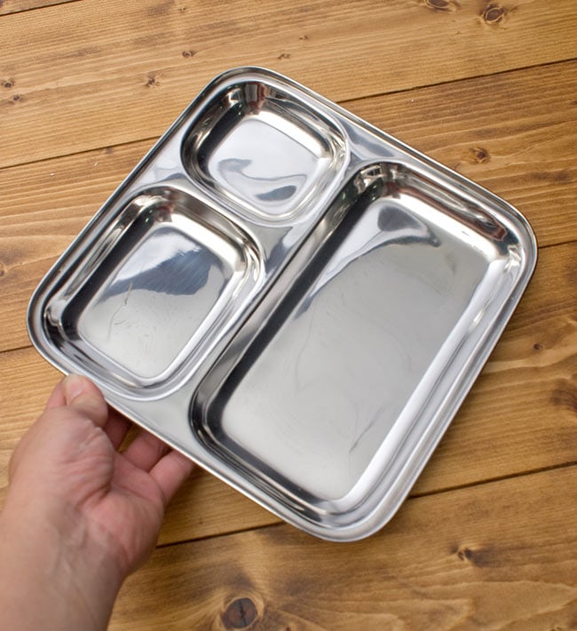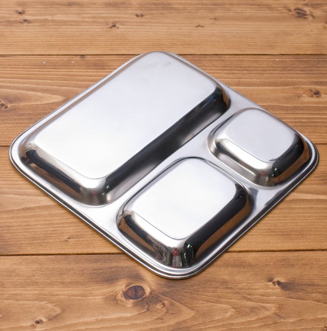 ステンレス製の3分割されたカレー用のプレートです。インドでは食堂などで使われ、小さい所にカレーを入れ、大きな所にはライスを入れて使用しています。カレーを入れるだけでなく、普通のランチプレートとしても使いやすいです。重ねて収納できますので、食器棚のジャマにもなりません。丈夫で長持ち、重厚感あるステンレス製ですので長くお使いいただけます。