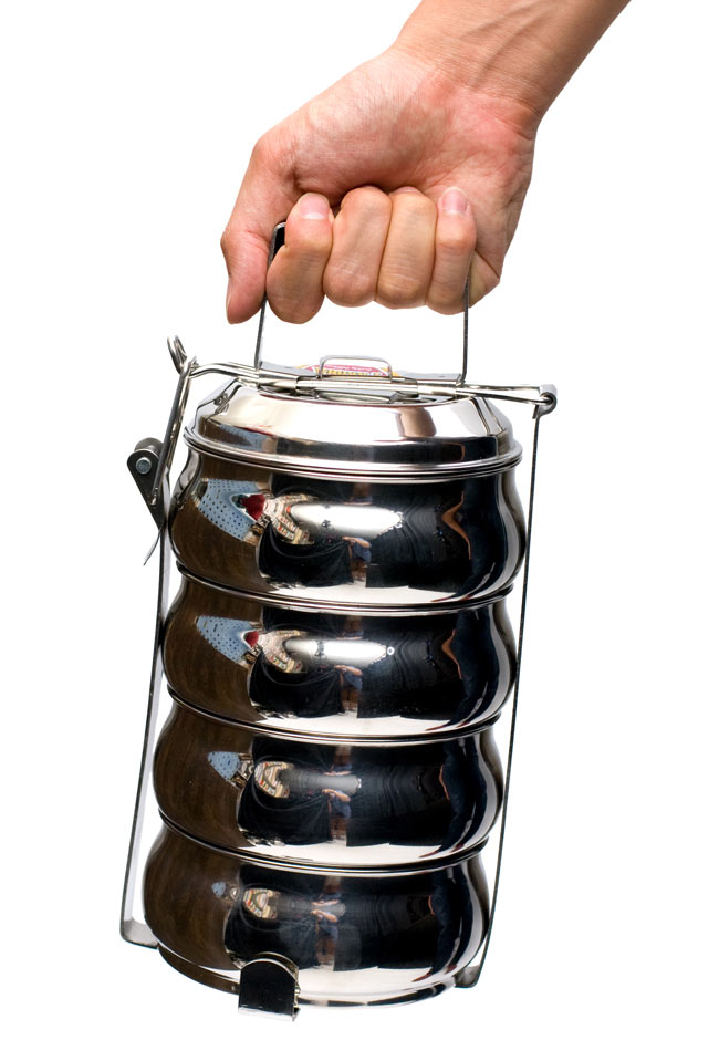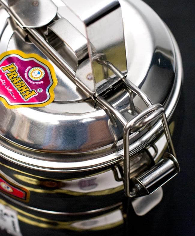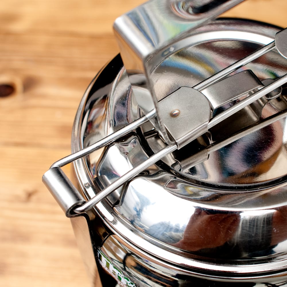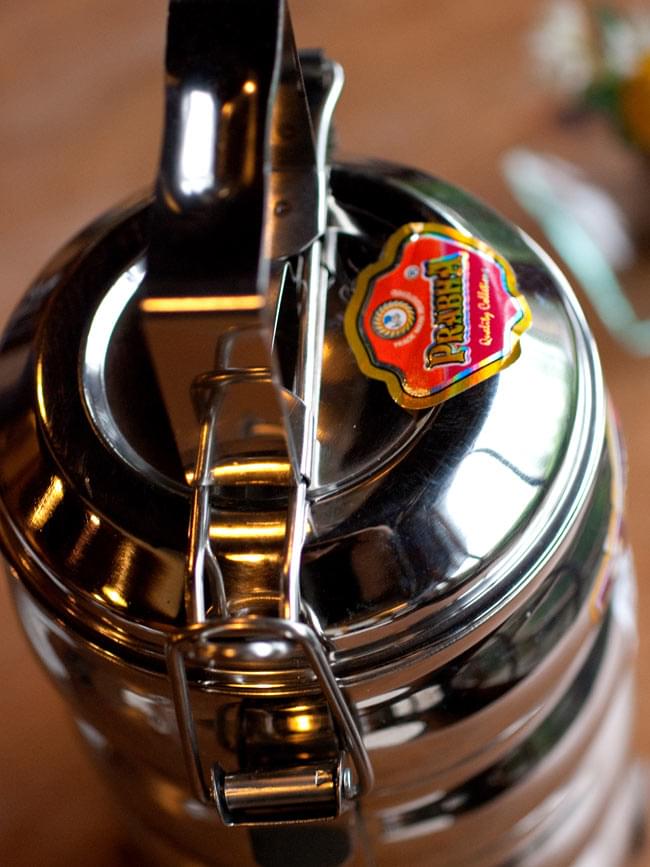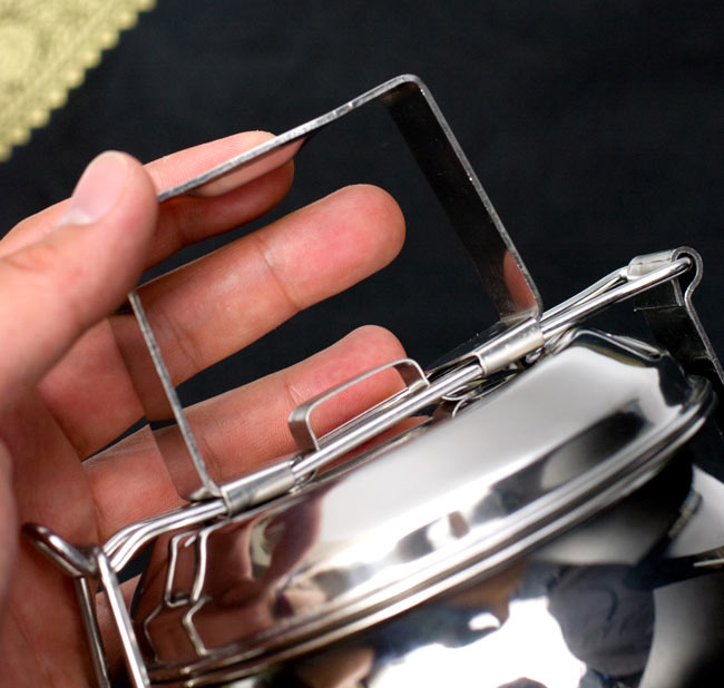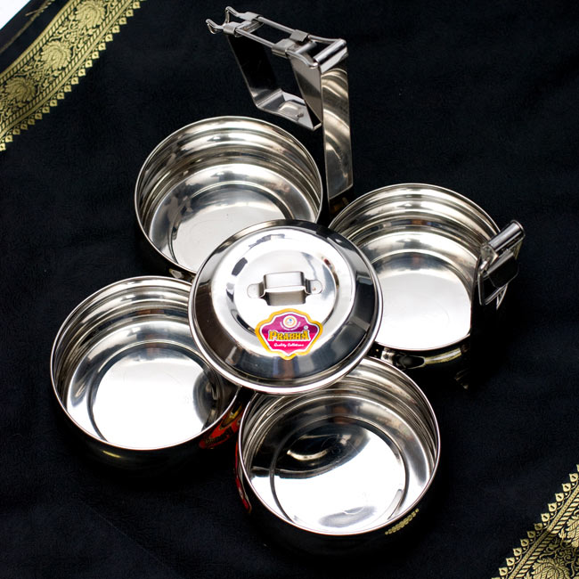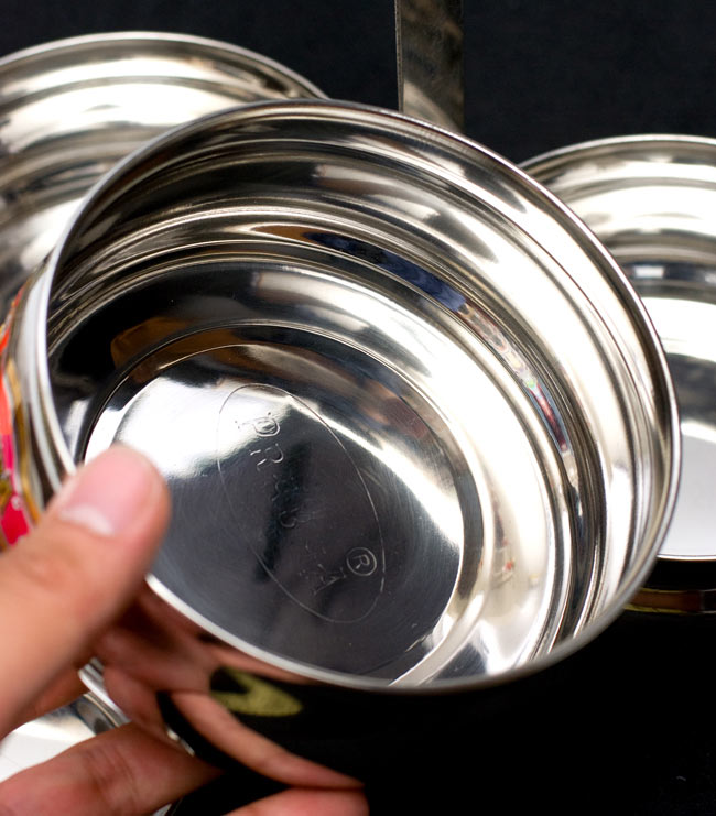 「カレーなどを入れても漏れない」といわれるインドの不思議な弁当箱。下段にご飯、上に汁気のあるカレーなどを入れて使用します。 ちなみに、汁物が漏れづらいのは一番上の段のみで、中・下段は漏れやすいので、 汁物は必ず上段に入れてご使用ください。ティラキタの実験では、水を入れてさかさまにすると最初は少し雫が垂れますが、その後まったく漏れなくなりました。水蒸気がシールの代わりになるのだと思います。ただ、日本の製品のようにパッキンが入って気密性になっている訳ではありませんので、逆さまにして振ったりはしない方がいいかと思います。