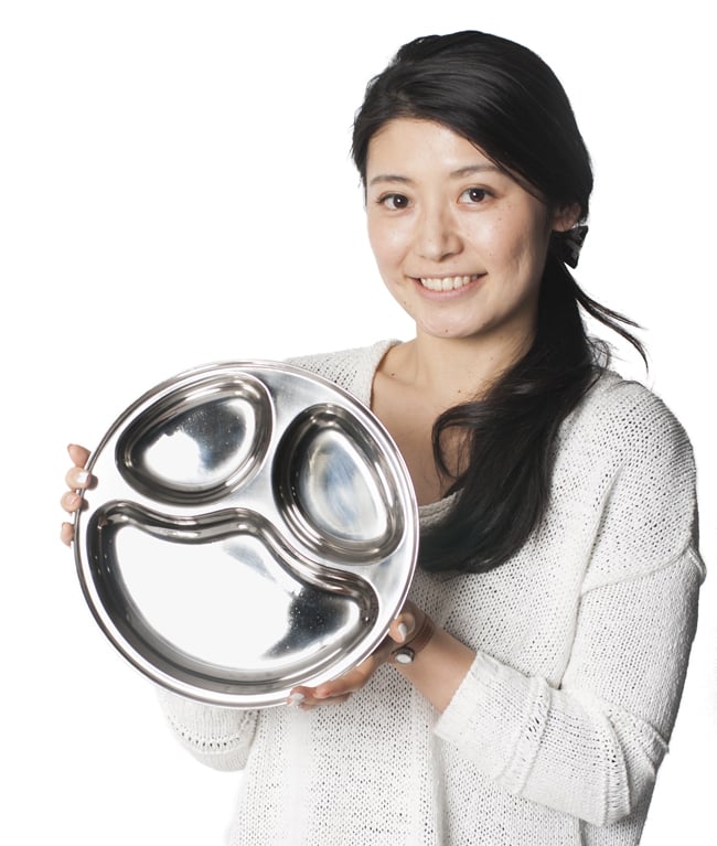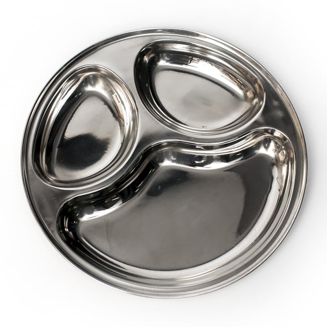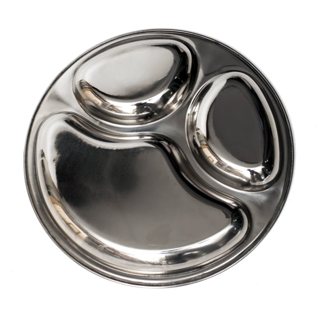 インドのレストランや家庭で広く使われているステンレス製のランチプレート。丈夫で長持ち、重厚感あるステンレス製ですので長くお使いいただけます。一つ一つの仕切りは多少深さもあるのでインド風にカレーを入れてもいいですし、普通のランチプレートとして色々なお惣菜を入れてもいいですね。こちらのお皿は特にパオバジをイメージして設計されているようです。独特のパンとカレーを組み合わせてお楽しみ頂くのにぴったりの大きさです。もちろんカレーを盛りつけても楽しいので小盛りのプレートをおつくりください。