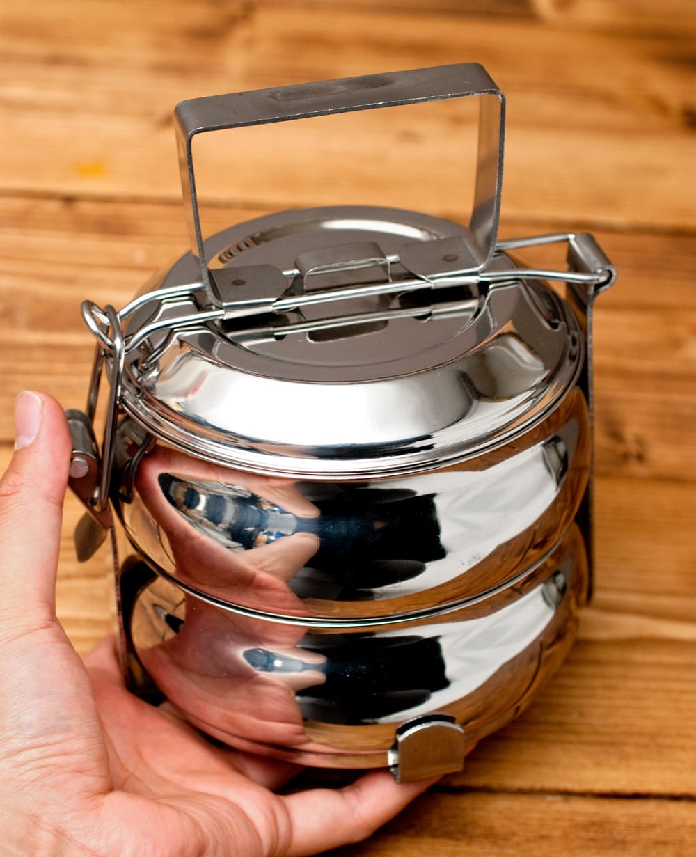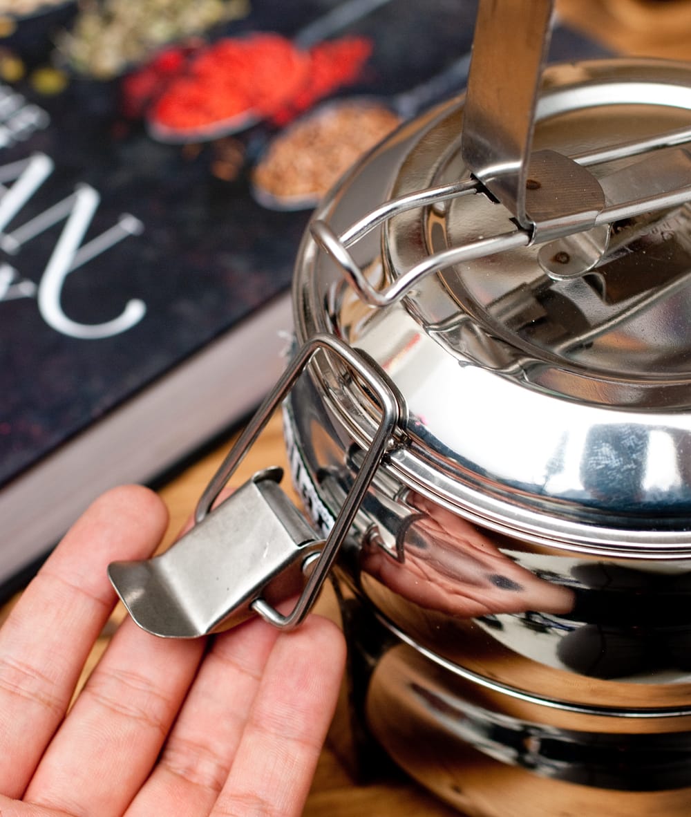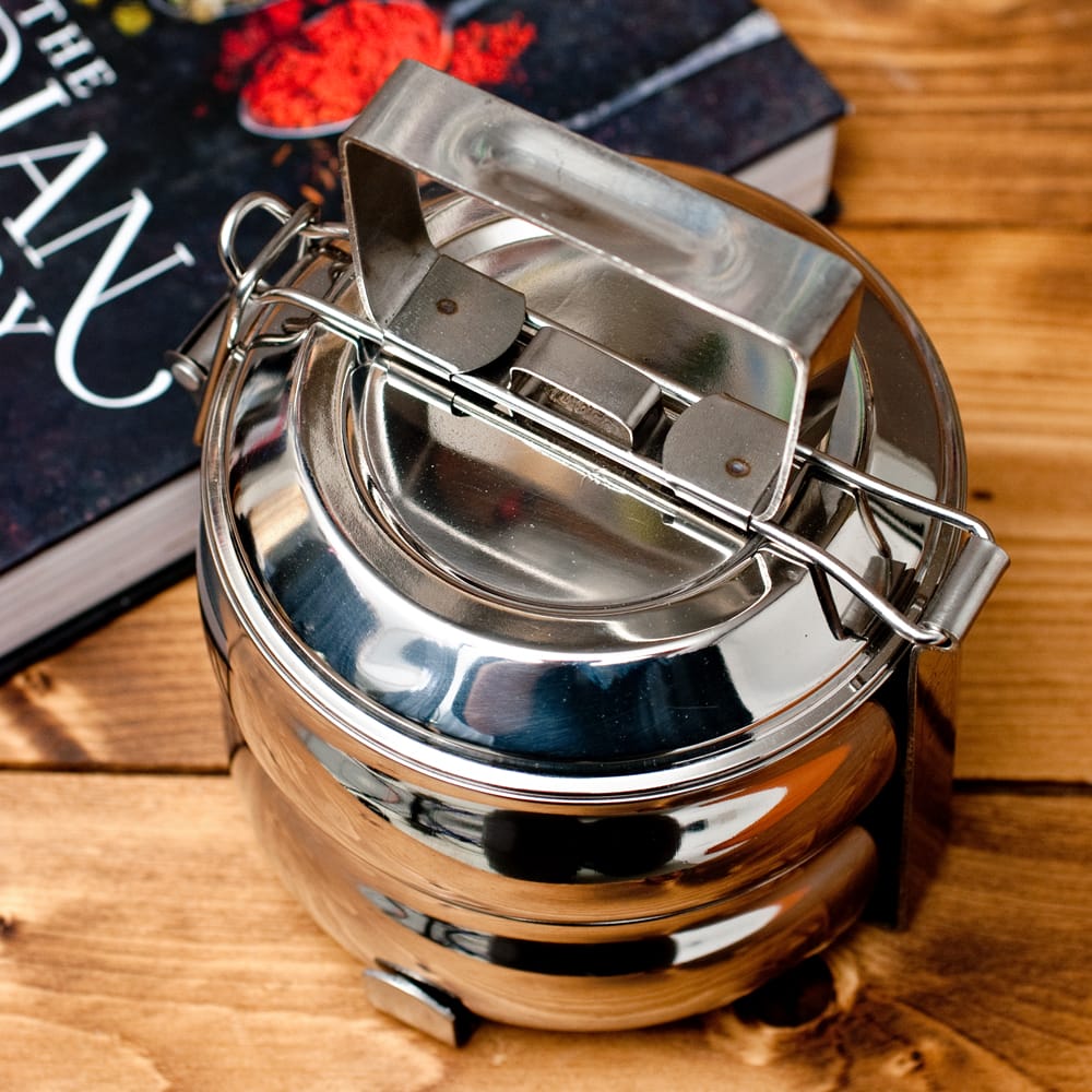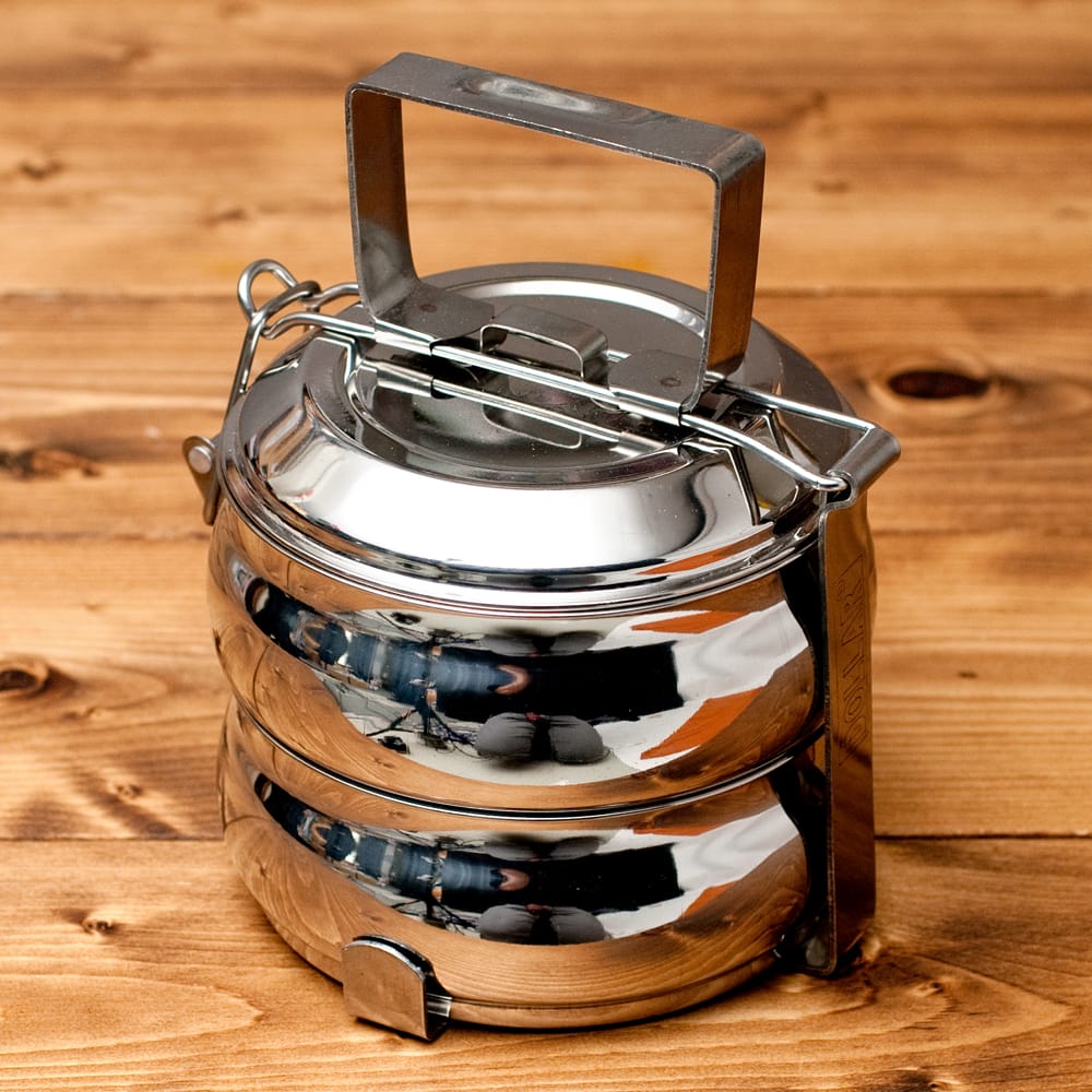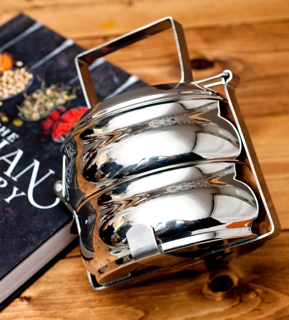 「カレーなどを入れても漏れない」といわれるインドの不思議な弁当箱。下段にご飯、上に汁気のあるカレーなどを入れて使用します。 ちなみに、汁物が漏れづらいのは一番上の段のみで、中・下段は漏れやすいので、汁物は必ず上段に入れてご使用ください。ティラキタの実験では、水を入れてさかさまにすると最初は少し雫が垂れますが、その後まったく漏れなくなりました。水蒸気がシールの代わりになるのだと思います。ただ、日本の製品のようにパッキンが入って気密性になっている訳ではありませんので、逆さまにして振ったりはしない方がいいかと思います。