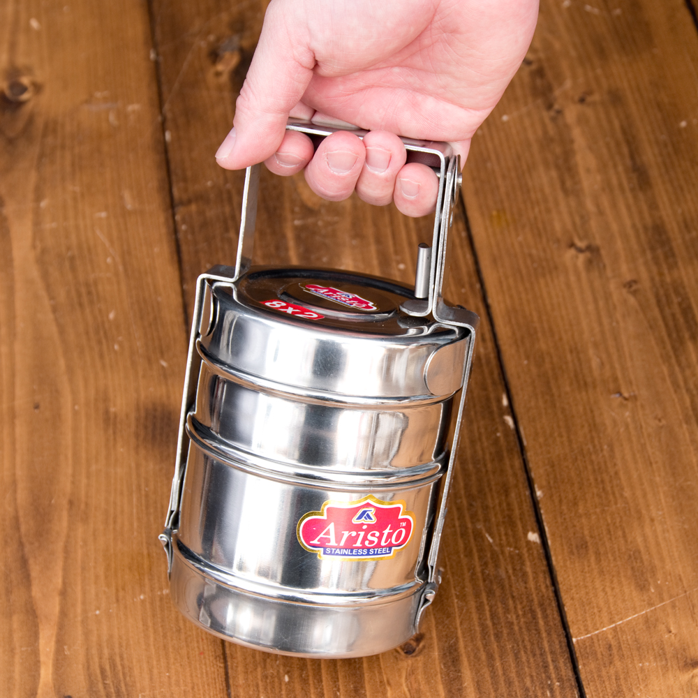 「カレーなどを入れても漏れない」といわれるインドの不思議な弁当箱。下段にご飯、上に汁気のあるカレーなどを入れて使用します。 ちなみに、汁物が漏れづらいのは一番上の段のみで、中・下段は漏れやすいので、汁物は必ず上段に入れてご使用ください。ティラキタの実験では、水を入れてさかさまにすると最初は少し雫が垂れますが、その後漏れなくなりました。水蒸気がシールの代わりになるのだと思います。ただ、日本の製品のようにパッキンが入って気密性になっている訳ではありません。漏れる可能性があるので、あまり逆さまにして振ったりはしない方がいいかと思います。