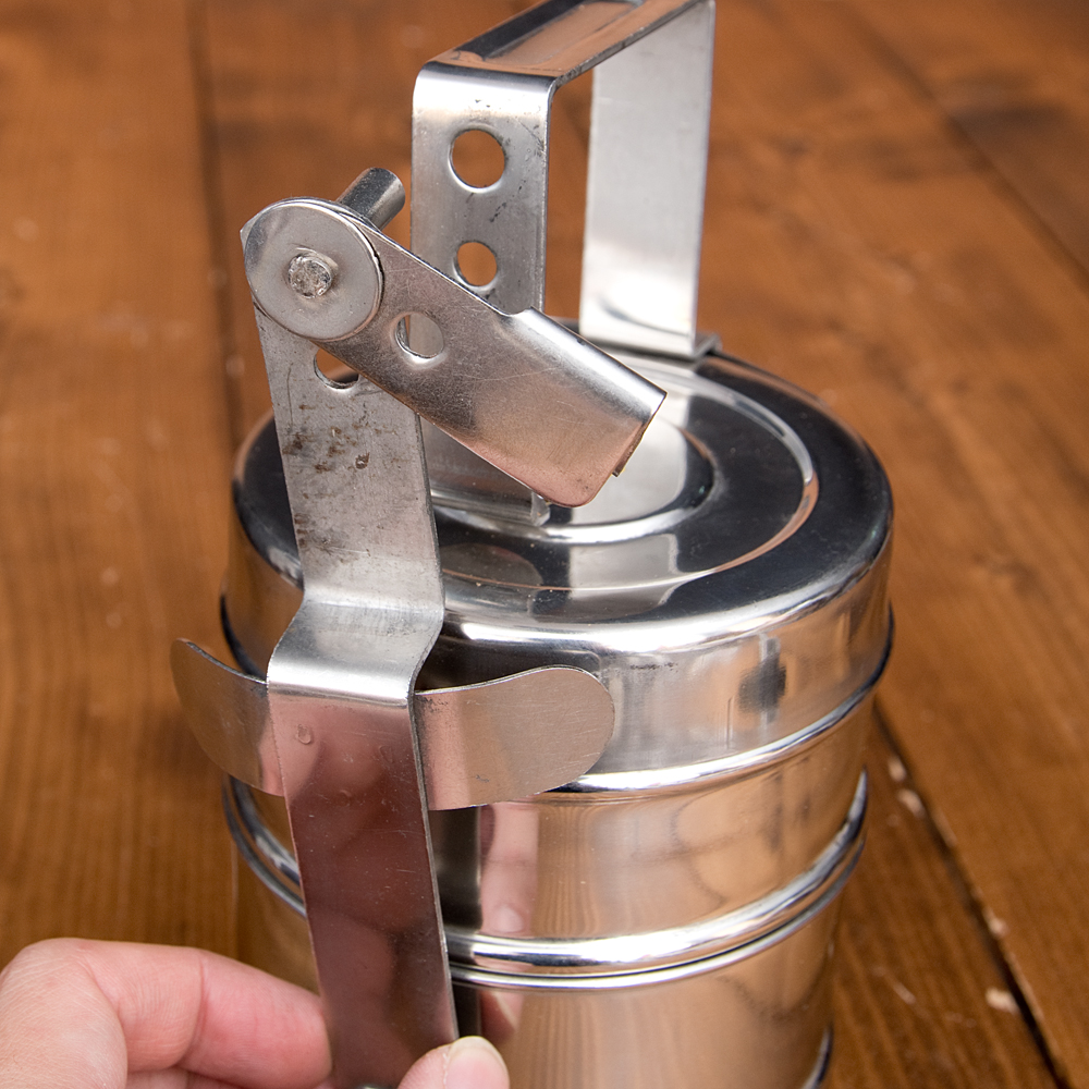 インドでは、お手伝いさんや子供の盗み食いを防ぐため、鍵付きの冷蔵庫が流通しています。さらに、電車の駅に行くと、売店ではいかつい鎖と南京錠が、カバンなどの盗難防止として販売されています。ちょっと高い楽器もケースは鍵付きです。鍵を掛けて、きちんと自衛するという意識の根付いた、インドならではのお弁当箱です。