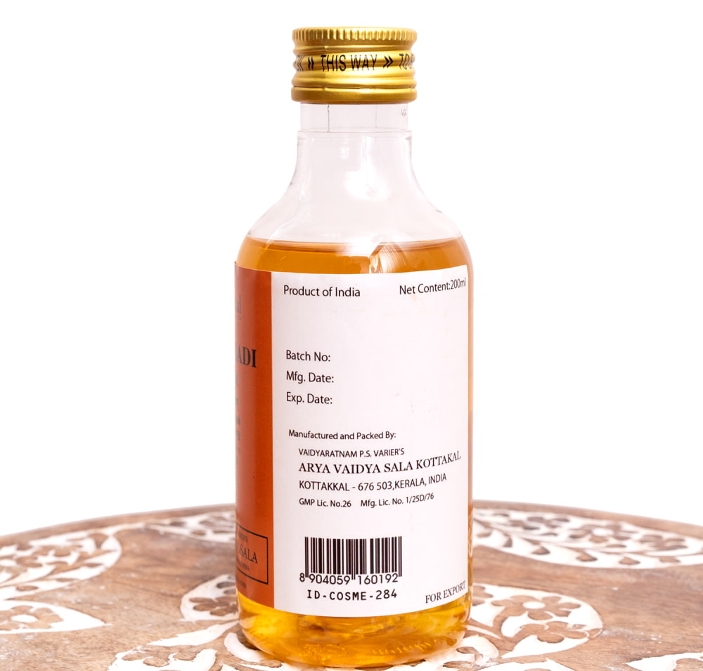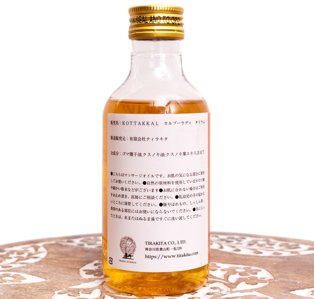 ![【送料無料・6個セット】KOTTAKAL カルプーラディ タイラム[Karpuradi tailam 200ML] 4 - 製造元、ロット番号、消費期限などのエリアです。実際にお届けする商品にはロット番号や消費期限が入ったものが届きます](https://www.tirakita.com/cosme/Photos/set_cosm_130_4b.jpg)