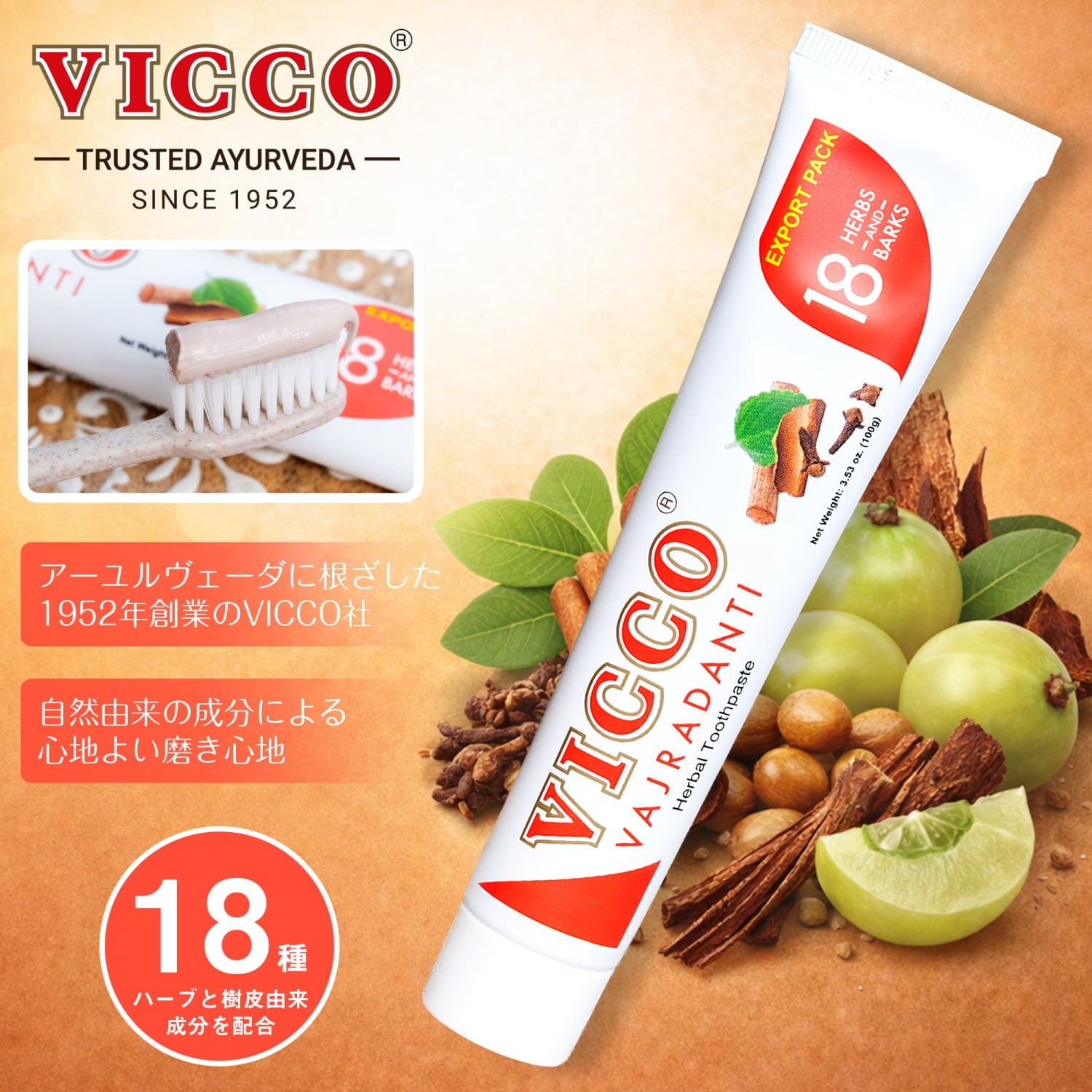 VICCO VAJRADANTI(ヴィッコ ヴァジュラダンティ)は、インドで70年以上にわたり親しまれてきたVICCO社による、アーユルヴェーダの考え方に基づく歯磨き粉です。この歯磨き粉には、天然のハーブや樹皮など18種類以上の植物由来成分を使用。