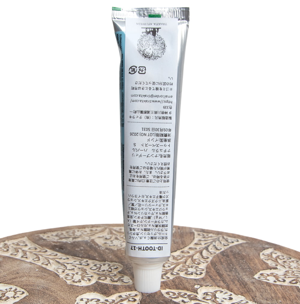 フレッシュな磨き上がりのアーユルヴェーダ歯磨き粉です。外箱は付属しません