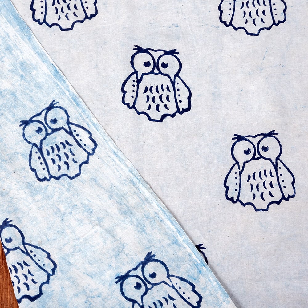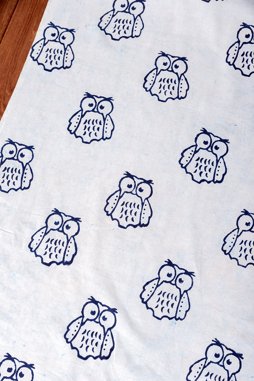 〔1m単位切り売り〕伝統の木版染め シンプルでかわいい動物デザイン布 フクロウさん ホワイト&ブルー系〔幅約112cm〕 x 5個