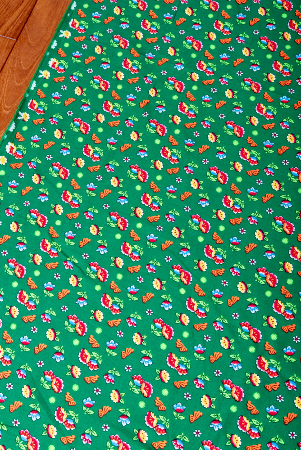 【5個セット】〔1m単位切り売り〕アジアのレトロ小花柄ファブリック ヴィンテージ風 昭和レトロ〔約130cm〕 - グリーンの商品写真 3枚目 生地を広げてみたところです。横幅もしっかりあります。注文個数に応じた長さにカットしてお送りいたします。