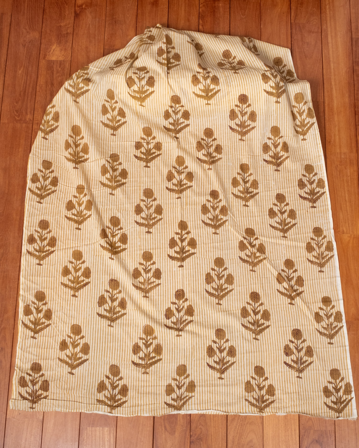 木版染めとは、ウッドブロック(木版)を用いて一つ一つ模様を染めこんだ優雅で贅沢な仕上がりの布です。大量生産には向かない、非常に時間のかかる丁寧な手仕事の賜物といえます。インドは美しい布の宝庫ですが、その中でも特に素敵な一枚に仕上がっています。ハンドメイドのウッドブロックプリントにしか出せない、独特のムラがありとても雰囲気があります。
