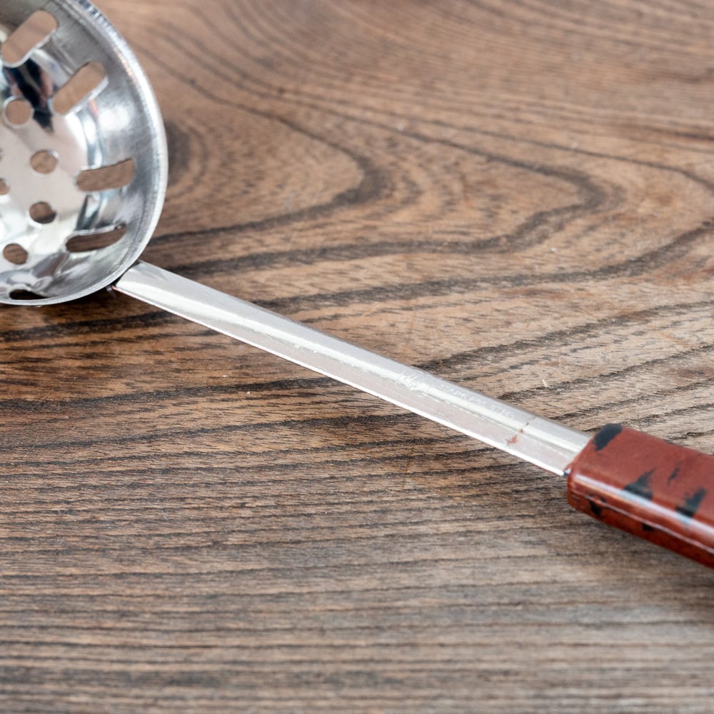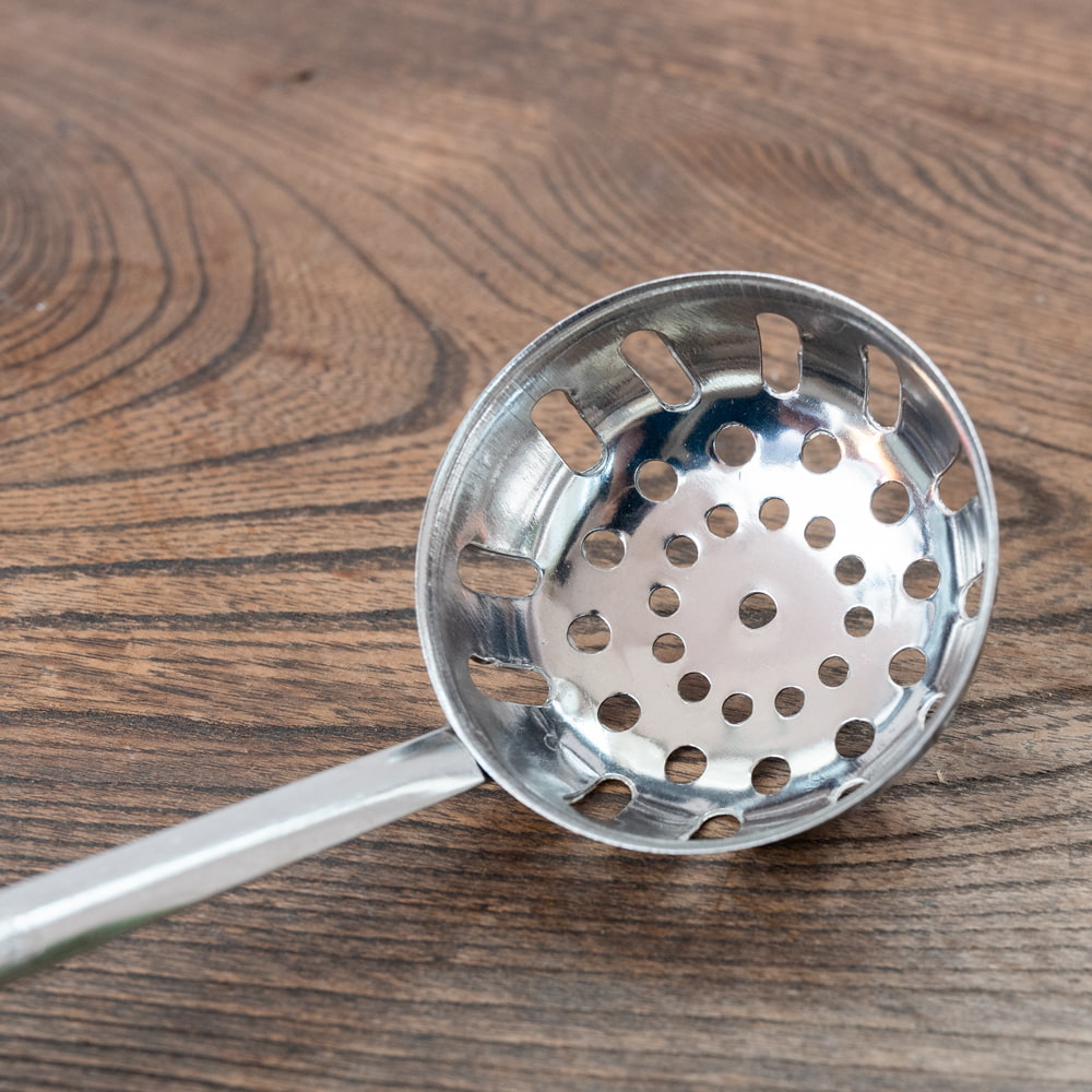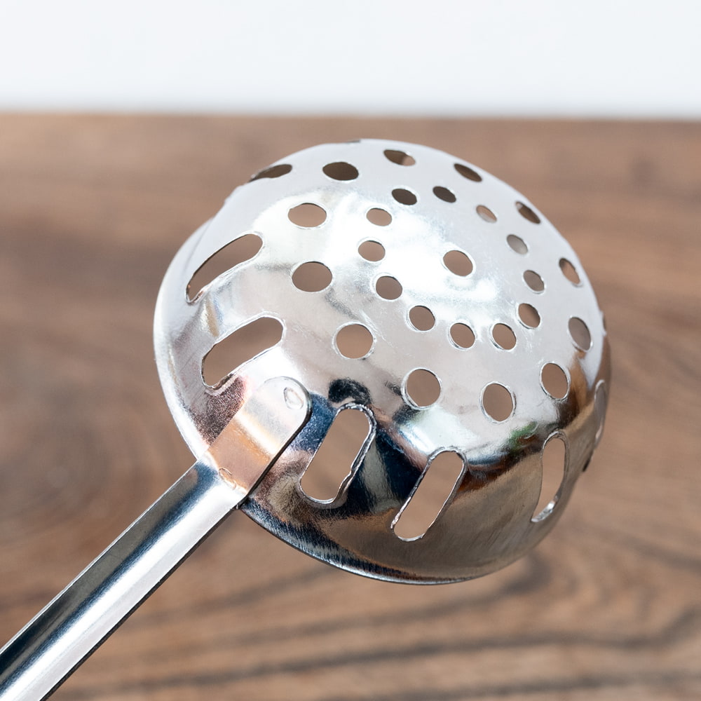 タイの屋台やキッチンなどで使われている穴あきお玉です。現地では、タイスキ鍋などで使われています。特徴的なのが深さ。普通のお玉よりも深いので、お鍋から具材を取り出しやすく、とっても便利。持ちて部分は、プラスチックになっているので、熱さが伝わらず使いやすいです。タイ料理、アジア料理だけではなく、さまざまな料理へオススメ。日本のご家庭や飲食店さんなどでも、日常的に活躍してくれそうです。