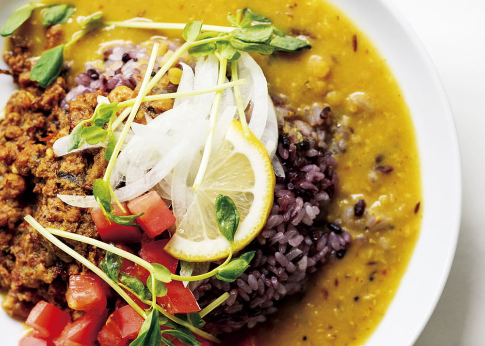 あいがけとは、2種類のカレーを半分づつ楽しめるハーフ&ハーフカレーのことです。こちらの出汁キーマ&ガーリック・ダルでは、お出汁の味が楽しめるキーマカレーと、ガーリック風味が特徴のお豆カレーの2種類をお楽しみいただけます。■大阪 四天王寺 虹の仏