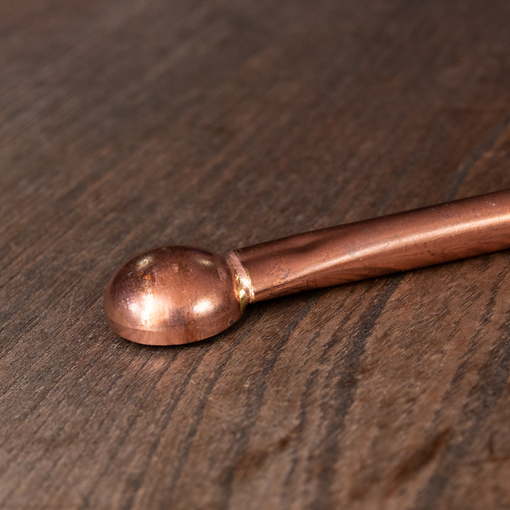 インド・アーユルベーダで非常に高い位置づけにある、銅が用いられています。プージャ関連の品でも、好まれている素材です。柔らかい性質で、変色もし易い為、多少の変色や、でこぼこは否めませんが、それがかえって愛着をもたらしてくれますね。