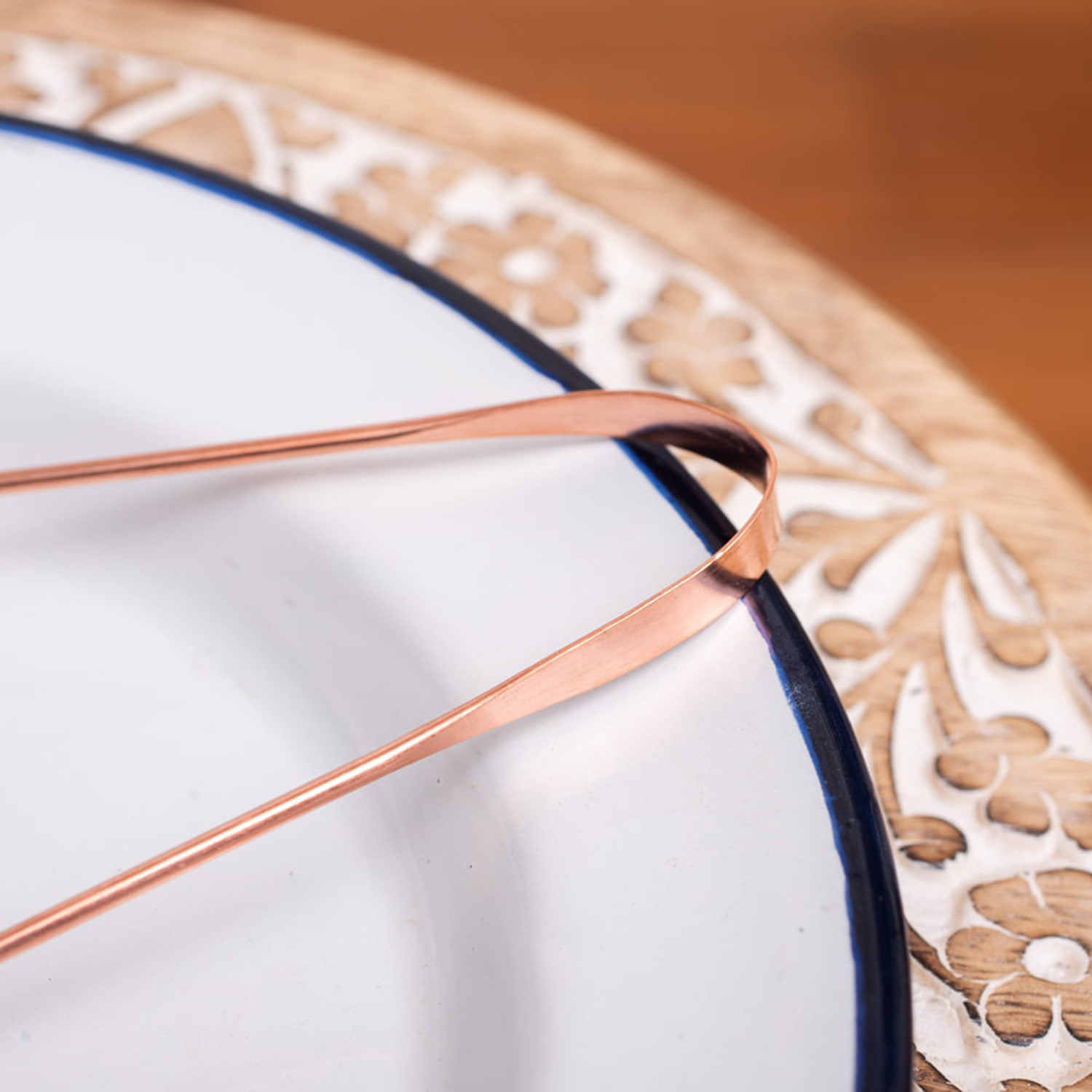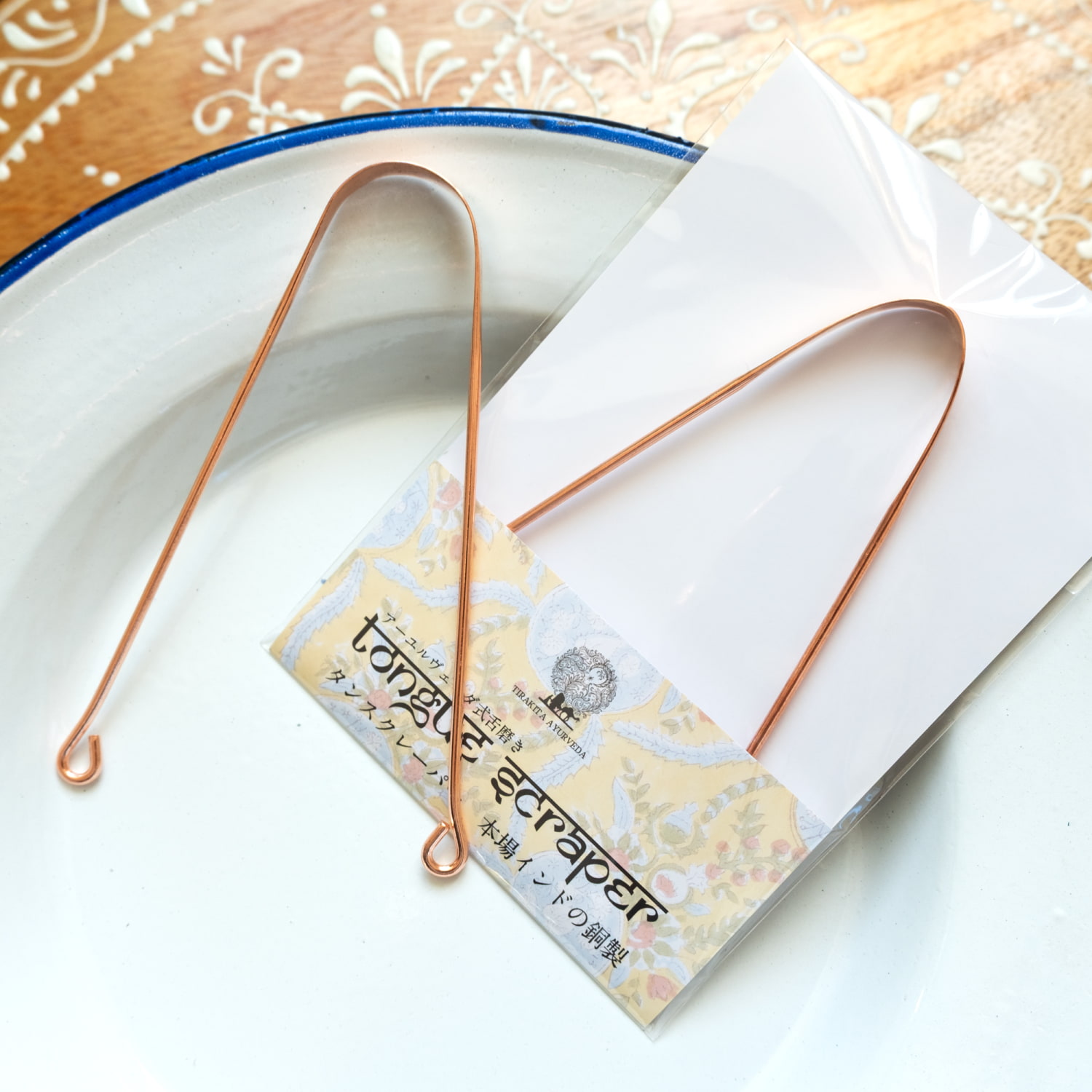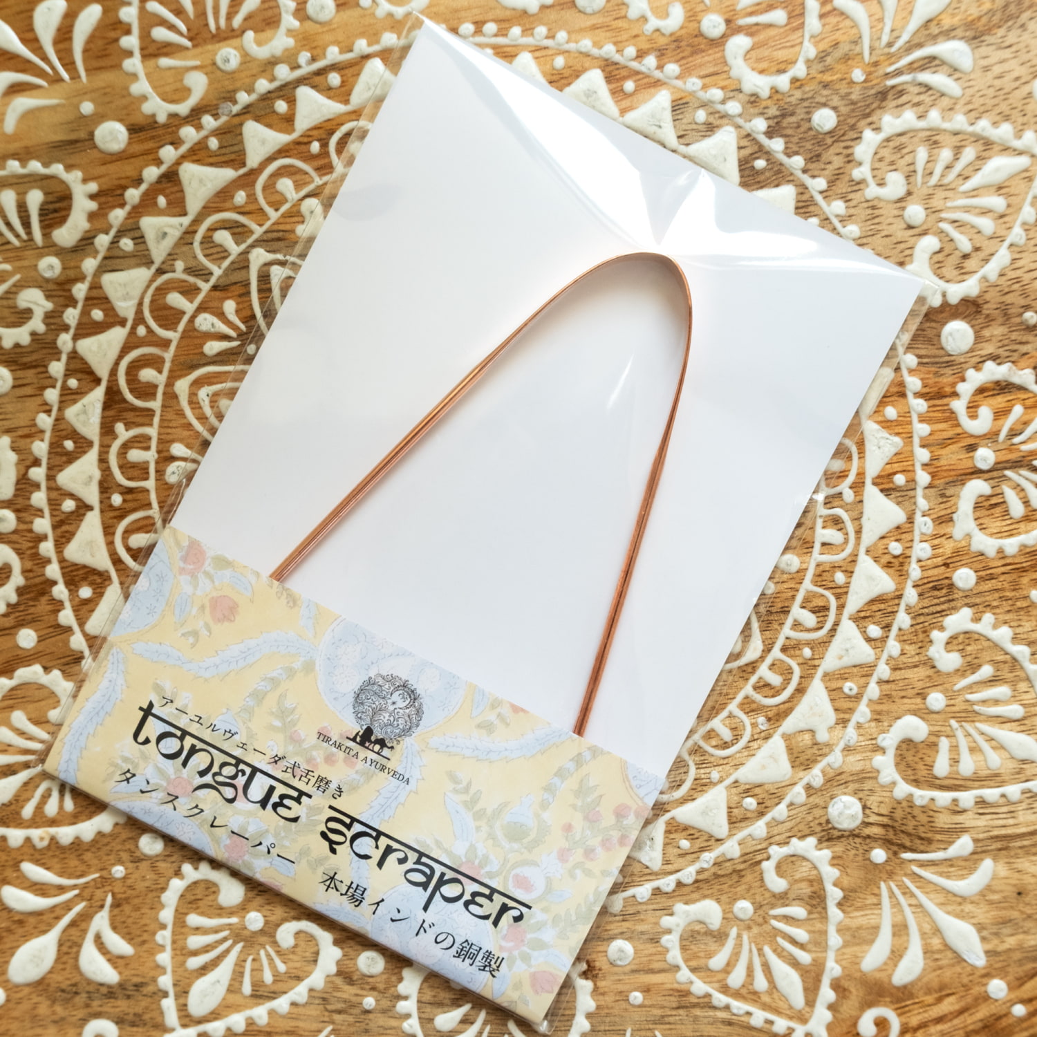 「アーユルヴェーダ」では舌の汚れ(舌苔)はよくないものと考えられ、除去するべきと考えられています。そこに登場するのがこの「タン・スクーレーパー」です。舌磨きの本場、インドからやってきました。こちらは銅製となっております。銅は、アーユルヴェーダで良いとされ、ネティポットや水差しなど、様々な場面で使われている素材です。