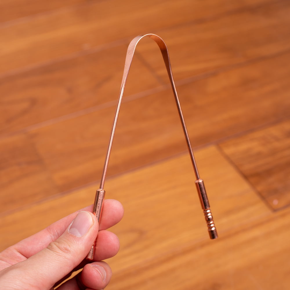 「アーユルヴェーダ」では舌の汚れ(舌苔)はよくないものと考えられ、除去するべきと考えられています。そこに登場するのがこの「タン・スクーレーパー」です。舌磨きの本場、インドからやってきました。こちらは銅製となっております。銅は、アーユルヴェーダで良いとされ、ネティポットや水差しなど、様々な場面で使われている素材です。