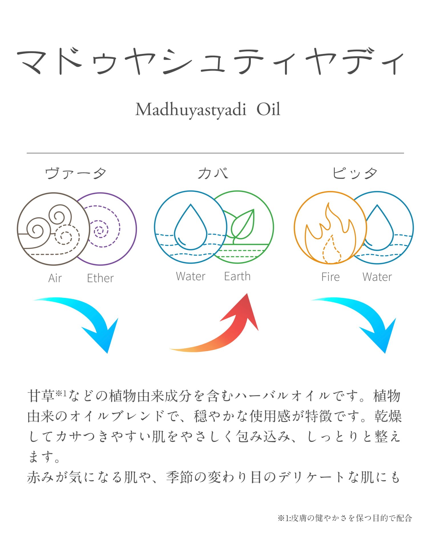 マドゥヤシュティヤディ タイラム(Madhuyastyadi Oil)は、ゴマ油(※1)、牛乳(※1)をベースに、13種類の植物由来成分を含むハーバルオイルです。植物由来のオイルブレンドで、穏やかな使用感が特徴です。乾燥してカサつきやすい肌をやさしく包み込み、しっとりと整えます。赤みが気になる肌や、季節の変わり目のデリケートな肌にも心地よくなじみ、やわらかくなめらかな肌へ導きます。軽やかな使用感で、全身の保湿ケアにおすすめです。