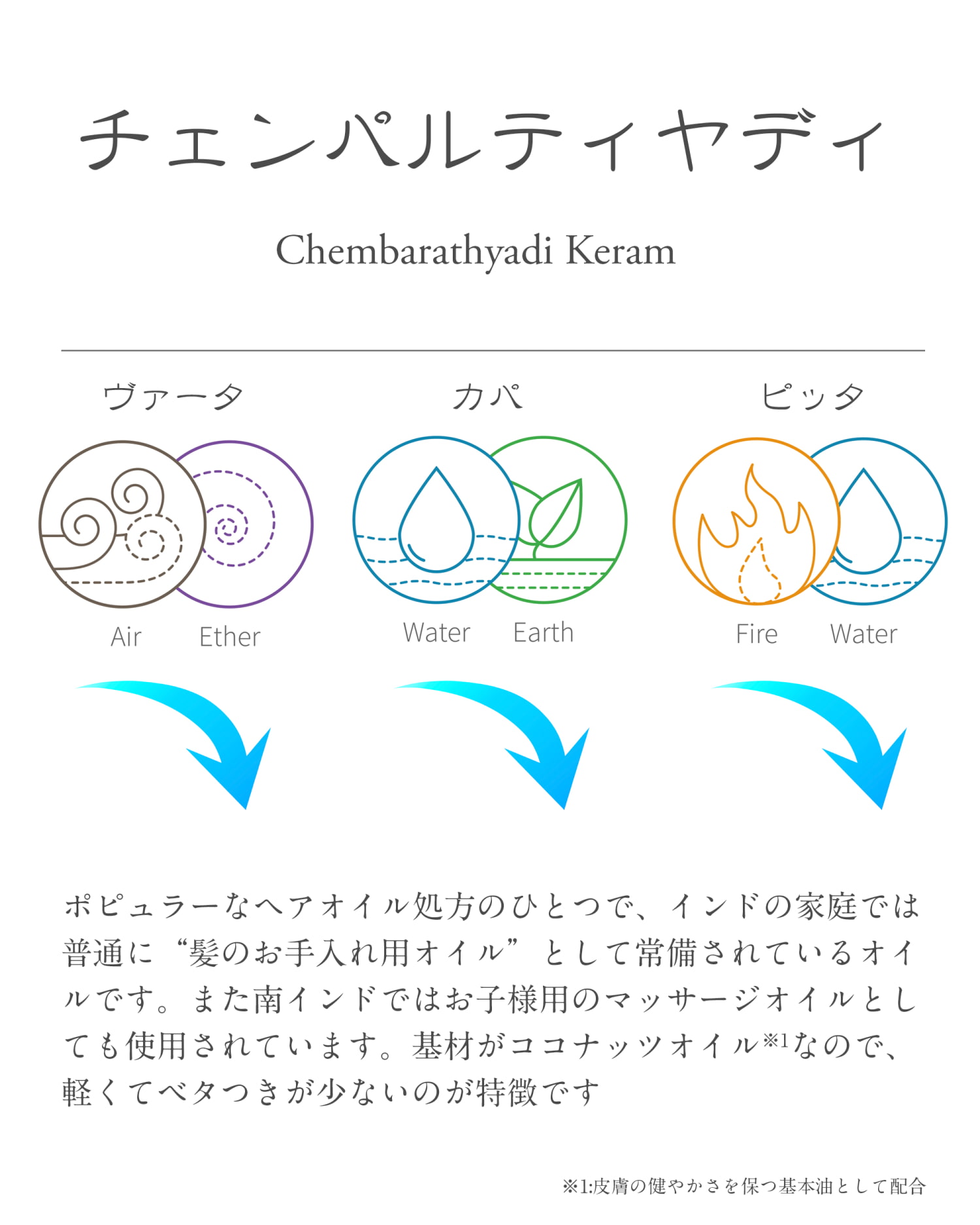 南インドではヘアオイルは、ココナッツオイルを使うものです。髪の毛と頭皮のすこやかさを保つには、ココナッツオイルが一番と信じられています。なので、こちらのオイルも基材はココナッツオイルです。