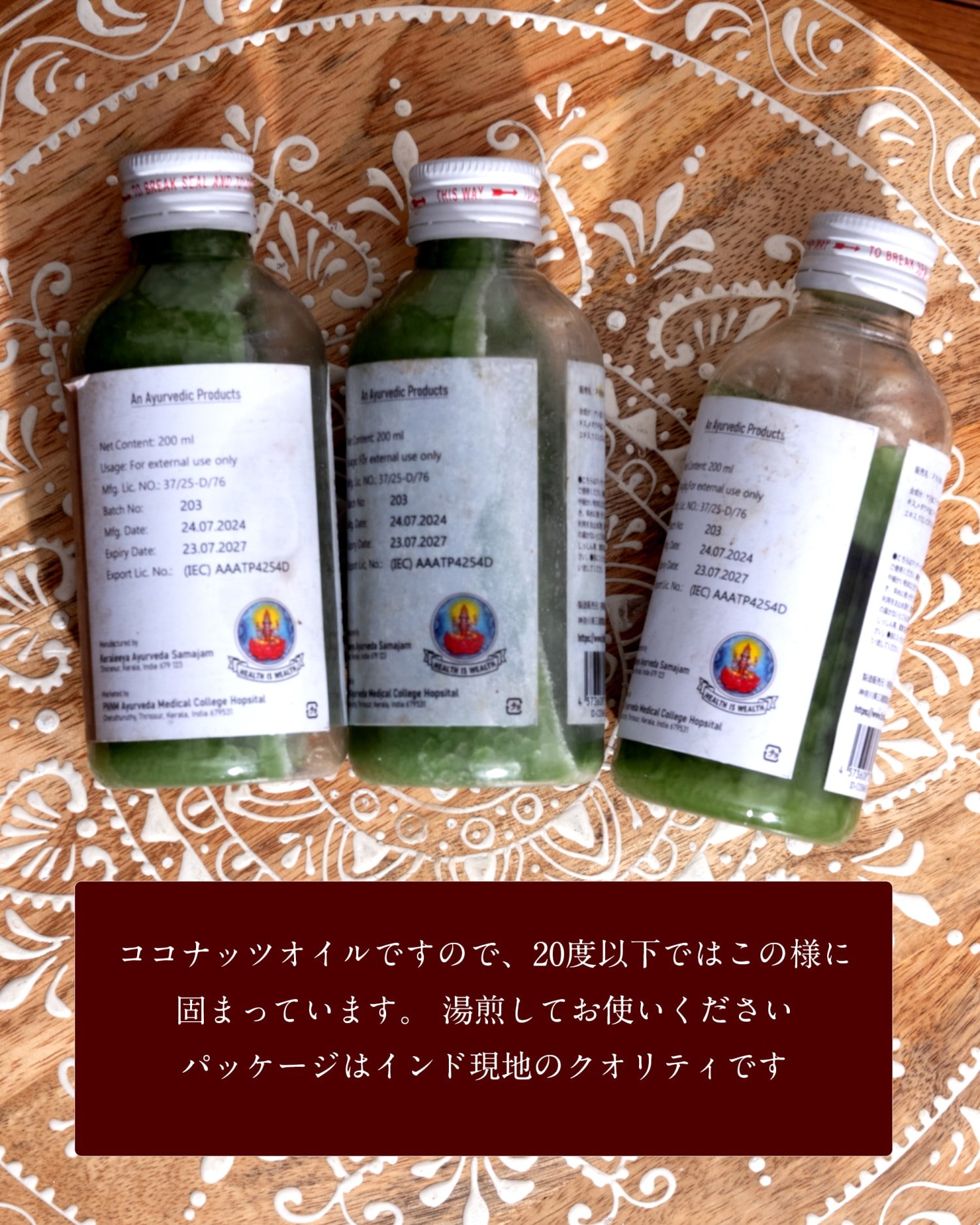 南インドではヘアオイルは、ココナッツオイルを使うものです。髪の毛と頭皮のすこやかさを保つには、ココナッツオイルが一番と信じられています。なので、こちらのオイルも基材はココナッツオイルです。ただ、大変残念なことに、ココナッツオイルは気温20度以下では固まってしまいます。ケララでは良くとも、日本の気候には合わないオイルです。南インドの伝統をそのまま紹介するのでなければ、基材を変更しますが、ティラキタでは、そのままの姿でご紹介することにしました。