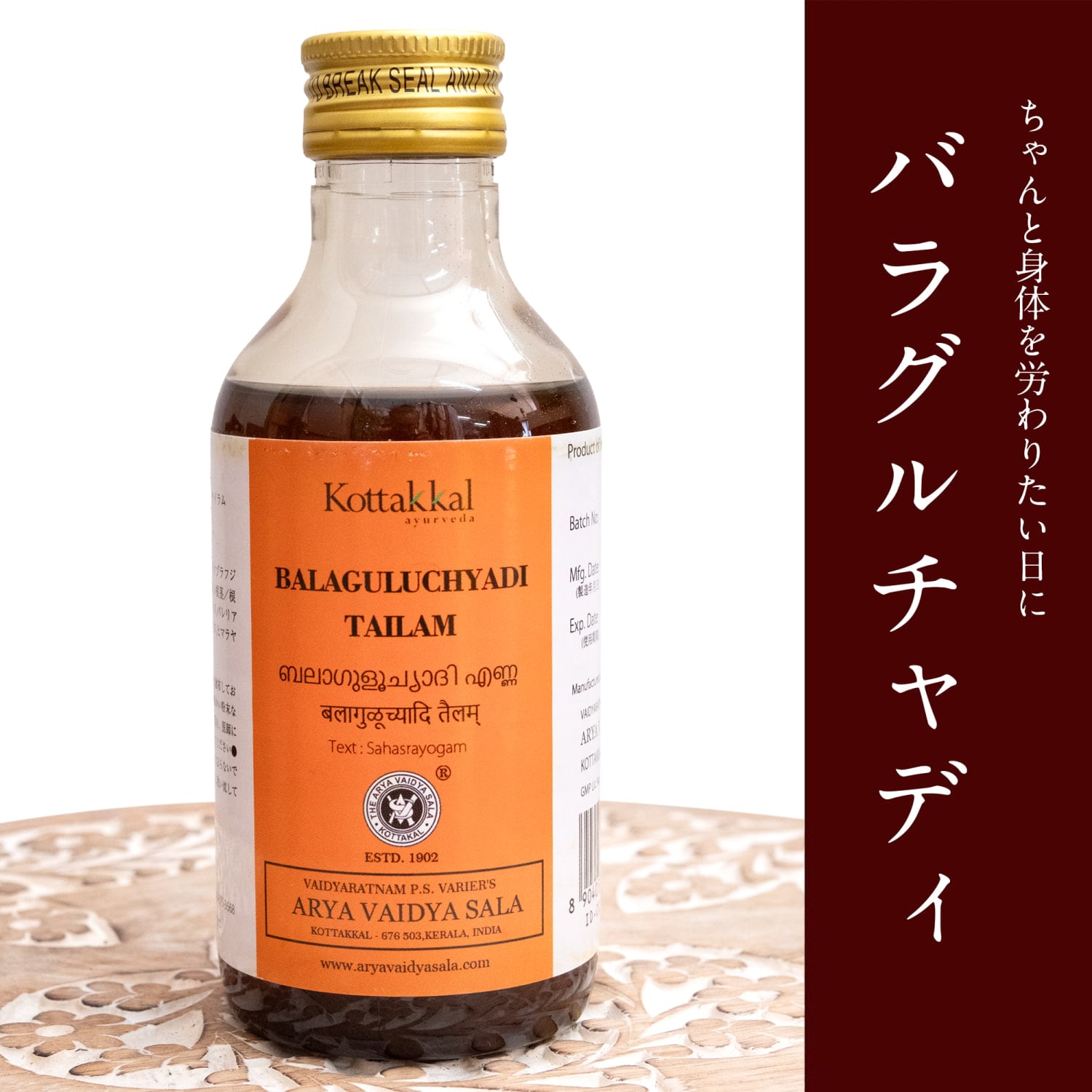 ![KOTTAKKAL バラグルチャディ タイラム[Balaguluchyadi Tailam 200ML] 5 - インドNo.1アーユルヴェーダ・カンパニー KOTTAKKALの正規品です](https://www.tirakita.com/cosme/Photos/id_cosme_318_5b.jpg)