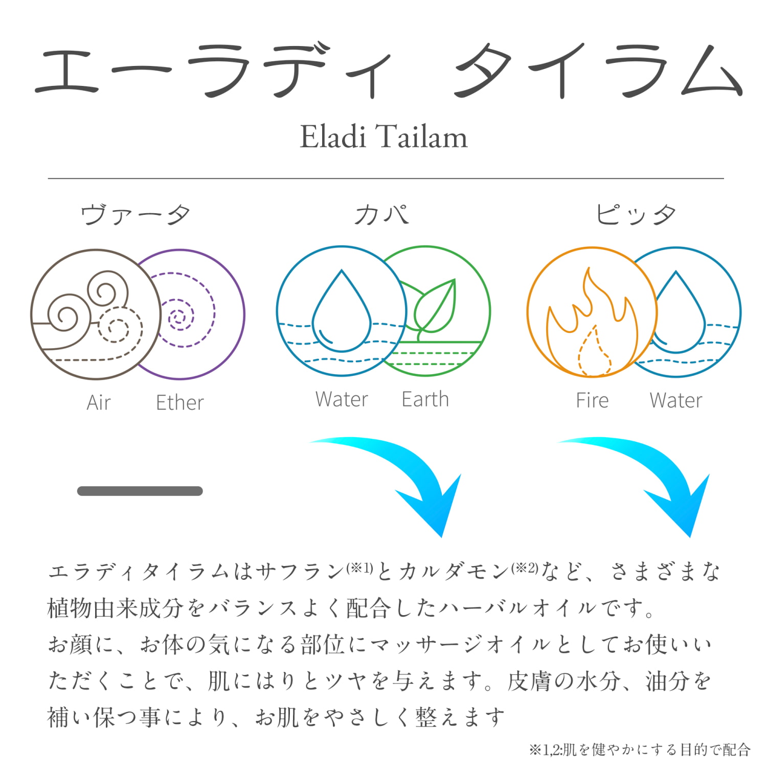 Eladi Tailamは、アーユルヴェーダの伝統に基づき、さまざまな植物由来成分をバランスよく配合したハーバルオイルです。カルダモン(※1)、ブラックカルダモン(※2)、シナモン(※3)、サフラン(※4)などのスパイス系ハーブが使用されており、お肌を整え、うるおいを与えるとともに、独特の香りとしっとりとした使用感が特長です。スキンケアやボディケアの一環として、オイルマッサージや保湿ケアに取り入れられています。香りとともに、心と体のリフレッシュタイムを演出します。