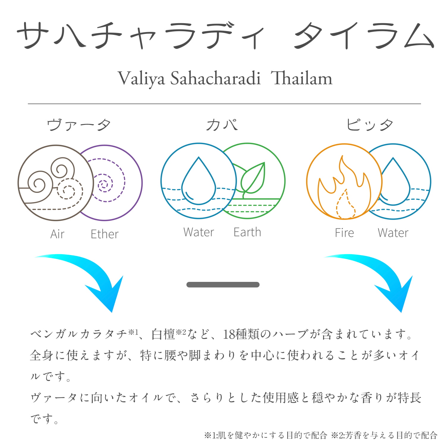 ヴァリヤ・サハチャラディ・タイラムは、アーユルヴェーダに伝わる伝統処方に基づき、植物由来成分を用いてつくられたハーバルオイルです。主な成分にはベンガルカラタチ(※1)、オオナタミノキ(※2)、ベチベル(※3)、白檀など(※4)、18種類のハーブが含まれています。伝統的に全身のオイルトリートメントに用いられてきました。ヴァータに向いたオイルで、さらりとした使用感と穏やかな香りが特長です。日々のセルフケアやマッサージの時間を快適にサポートしてくれます。特に、腰や脚まわりを中心に、ゆったりとした時間とともに使われることが多いオイルです。