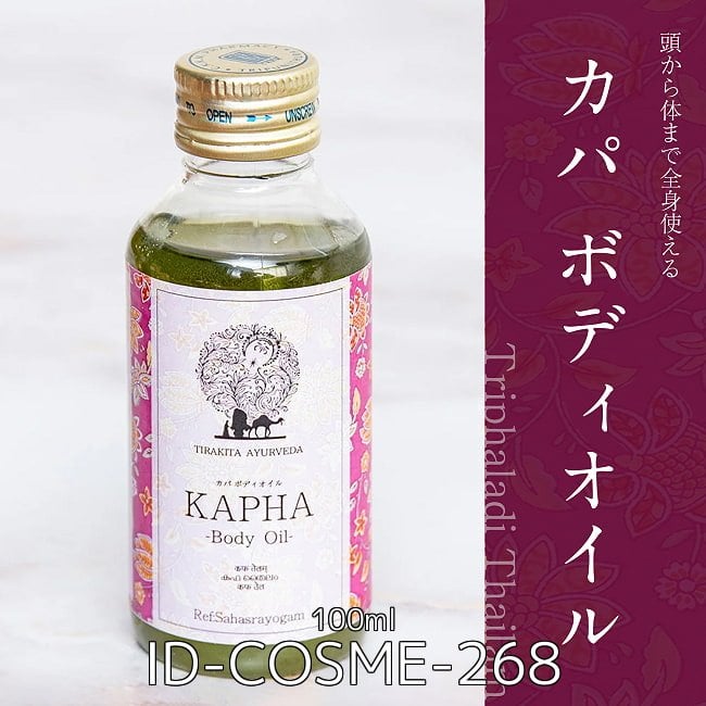 ![【6個セット】ティラキタ カパ ボディ オイル [Kapha Body Oil - Tripharadi thailam] 100mlの写真](https://www.tirakita.com/cosme/Photos/id_cosme_268.jpg)
