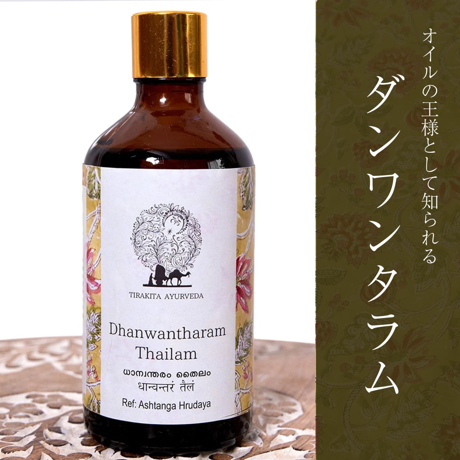 ![【6個セット】ダンワンタラム タイラム[Dhanwantharam Thailam 100ml] 3 - 斜めから撮影しました。かわいいガラス瓶にウッドブロックの伝統模様をあしらいました。](https://www.tirakita.com/cosme/Photos/set_cosm_159_3b.jpg)