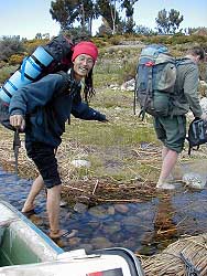 k日記ボリビア編 2000.4.12(水) ボリビアに戒厳令が発動していると言う情報を耳にする。一体、大統領は何の声明をした訳?と聞きたくなってしまった。ラ・パスに行っても身動きが取れないという情報も耳にした。じゃあ、駒を動かしても意味がないじゃない?と思ってしまった。下手をすると国境閉鎖なんて事態にもなりかねないと思い、一旦、ペルーに帰る事にする。早速、行動開始。荷物をまとめ、メイン道路脇で車を捕まえようと車を待ち構える。そして、やっと捕まった車は、私達が荷物を取りに部屋に戻った隙にどこかに消えてしまった。呆然自失・・・ 宿の前に溜まっていたパッカー数人に尋ねると「国境までの道路は、大きな石が置いてあるので通れないと軍隊が言っていた」そうだ。「今、船を聞きに行ってるから、ちょっとまってなよ」と言ってくれた。ので、せっかくだから便乗して国境まで船で行く事にする。 船は、思い思いの外人を乗せて静かにティティカカ湖を進んで行く。ようやくコパカバーナともお別れ。でも、長居をすると愛着が沸くもので、最初は嫌な所だと思っていたが、結構いい所だったと思えてしまう。こんな事がなければ、こんな感情は起こらなかったかもしれない。もう、二度と来ないだろうなぁ・・・ 1時間も船に揺られただろうか?船頭は、桟橋のない岸辺に船を寄せた。靴を脱ぎ、裸足で岸に降り立つ。ここから、土手を登って、民家の脇を通り、人の畑のあぜ道をすり抜け、ボリビア側の国境に到着。来た時の活気はどこへやら、閑散とした国境。 ボリビア側の道路を見ると大きな石が道の真ん中にゴロゴロ置いてある。ああ、あれじゃ車通れないわなぁと思う。イミグレのおじさんも客がくるとどこからともなく現われ、判をつき終わるとイミグレを閉め、またどこかに行ってしまう。ペルー側の国境も同じだった。スエット姿のオジさんがフラ〜とやってきたかと思ったらイミグレのオジサンだった。しかも、暇そうにハエをはたいていた。と言うことで、無事、ボリビア脱出。 タクシーを捕まえユングーヨの町へ。途中、歩いて国境に向う仲むつまじい外人さんカップルを見かけたが、これからボリビアに向ってどうするんだろうか?ペルー国内には情報がとどいてないのかしら?とよっぽどボリビアの情勢を教えてあげたかったが、あまりにも仲むつまじいのでやめた。 ユングーヨからプーノ行きのバスに乗り、すぐ出発。なんのことはなく午後3時にプーノに到着した。その足で、クスコ行きの夜行に乗ることに。クスコかアレキパか・・・と考えた末に友達がいるクスコに決めた。 朝からパン1つしか食べていなかったのを思いだし、ご飯を食べにプーノの町へ。ついでに旅行会社で、ラ・パス行きのバスがあるかどうか試しに聞いてみることに。すると・・・「ラ・パス行きならあるよ。朝の8時だ。一人25ペソだ」と言うので、更に突っ込んで聞いてみると「ん、スト・・・そんな話もあったナぁ。ああ、そうだ、コパカバーナまでで、ラ・パスには行かないかな」だと。そうやって、ラ・パスまでのチケット売りつけて儲けようってんだな。それに、コパカバーナまでだって来ないじゃないか。国境で降ろして「ハイさよならね」するくせに。こいつら、ボリビア人並みに相当ずるい・・・ バスを待つ間にうめちんたっての希望でアルパカ製のふわふわ敷き座布を購入。大事に抱えてバスに乗りこむ。いつまでも握りしめ、顔をスリスリしていた。来たときと変わらぬオレンジ色の輝きを見せるプーノの町が遥か遠くなっていく。いつのまにか眠ってしまったうめちん。あんなに大事にスリスリしていたアルパカ座布を私の方に投げて、落ちそうになっていても気がつかない。 そのうち、長い足の行き場に困ったらしく私の方にずんずん足を伸ばしてくる。通路側の足元には、少年が私の方に足を寄せて横になっている。荷物を全部抱え、小さくなって寝ようと努力した私。しかも、最近よく出るジンマシンが痒くて結局、よく眠れなかった・・・今日も訳のわからぬテレビだけが、コウコウとバスの中を照らしていた。 |
