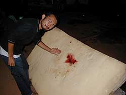 k日記ブラジル編 2000.7.6(木) ボア・ビスタから先のペルミソ・デ・アドゥワナ(輸入一時許可証)をボアビスタの税関で作ってもらい、コレから何も無い所を走るための食料をたくさん買い込み、マナウスに向けてボアビスタを出発した。 順調に走る牛次郎。アクセルを踏み込む快調な青山さん。あっという間にカラカライと言うちょっと大きな街に着いてしまった。地図を見ると、カラカライの先は、マナウスまで大きな町も無く小さな村落のみらしい。 カラカライのガススタで、満タンにガソリンを入れ、運転をうめちんに変わって走り出した。カラカライから少し走ると、大きな工事看板が目に入る。どうやら橋の工事をしているらしい。回り道の標識があったので、従うことに。すると、その道は、川に向かって伸びていて、川の中に飲み込まれていた。これは、どういうこと?前に進めないじゃないか?と、そんな心配はご無用。ちゃんと艀を着けた連絡船が行き来をしていた。 上手く艀に車を乗ると、ゆっくりと出発した。茶色の川をゆっくり進む。新しい橋は、真ん中の部分の桁をかけた所で、もうすぐ完成の様子。脚が高く、下を船が通れるように作っているらしい。はしゃぐうめちん。写真を撮りまくっているうちに、対岸に到着。ゆっくりと岸に着いた。走り出そうと、エンジンをかけようとするが、なかなかエンジンがかからない。そういえば、朝もエンジンがかからず、みんなで後ろから押したっけ・・・最近、エンジンのかかりが悪いなぁ・・・そんな事を思っているうちにエンジンがかかったので艀を降りる。 そして、まっすぐで何も無い道路を軽快に走り出した。思えば、アマゾンと言うイメージとは、程遠い道路だっと思った。木が生い茂り、ジェングルの中の1本道と言うイメージがあったのだが、実際は、道路の両脇の土地は、ほとんどが人間が開拓した牧場と化していた。そうじゃない所は、緑が削られ赤い大地が丸見えの壊れたジャングルばかりだった。何か違うな?そんな感じがした。牧草地ばかりを見ていると、やっぱり飽きて来るので、後ろに下がって本を読み始める。 と、突然のキューブレーキ。そして「ちょっと、人が死んでる!!」と言う、うめちんの叫びに耳を疑う。そして、膝折りで窓の外を見ると数台のトラックが両脇に停まり、そのうちの1台の後陰の道路に少し小太りのオジさんらしき人が捨てられるように横たわっていた。私には、そう見えた。反対側では、路肩の向こうの湿地帯で炎上している車の消火活動を数人で行なっていた。 車を路肩に停め「k、後ろの絨毯剥いで。怪我人運ぶから」そうはき捨てて、外に出て行ったうめちん。急いで、荷物をどけ、絨毯を剥がすと、数人の男が血だらけの若い女性を運んできた。苦しそうに「ウー、ウー」と唸っている。青山さんの枕をあてがい、苦しくない体勢を取らせる。どうやら、腰を強く撃ったらしく脚の付け根が痛いらしい。それと、顎を強く撃ったらしく横にパックリ切れていた。そのせいかどうかは知らないが、大量の血がのどに流れ込み苦しいらしい。 そして、もう一人。先ほど、窓から見ていた人はと、窓の方を振り向くと、みんなで運ぼうとしているようだった。一人の男が、腕を取り脈を計って、腕をポイっとほおってしまっていた。どうして?もしかして、もう・・・そう思った。体が大きいので5.6人で、持ち上げ車に運んできた。よく見ると頭を短く切っていたのでオジさんかと思っていたがオバさんだった。 こちらはすでに、死亡していたようだ。左わき腹に30cmほどの深い斬り傷があり、もう血は止まっていた。耳から血を流していた。二人を横たえると、一人のおじさんが乗ってきた。どうやら、この人も被害者らしかった。鼻から血が出たような跡があり、洋服も血だらけだった。そして、意識不明のオバさんの名前を一生懸命呼んでいた。 「どこの病院へ行けばいいんだ!!」と怪我人をはこんできたオジさんに聞くと「カラカライの病院だ!!そこが一番近いから」え?カラカライってさっき青山さんとうめちんが運転変わったところ?それって、ココから1時間くらいあるんじゃない?逆方向には病院ないの?せっかくココまで来たのに戻るのやだなぁ・・・不謹慎だけど、正直そう思った。でも、人助けだから行くしかない。「飛ばすよ!!」うめちんの言葉で、狭い道路で何度も切り返しをし、Uターン。カラカライに向けて牛次郎、猛ダッシュ。 今までにない速度で走る牛次郎。いくつもの峠を越える。その度、今度こそあの大きな橋を作る所が見ええるはず・・・そう思って何度も期待を裏切られる。心ばかりが早く着かないかと焦っていた。 猪飼さんが、若い女性の面倒を見ていた。ウーウー唸っているが、意識があるらしく、声を掛けると手を上げて答えていた。すでに死亡しているオバさんの頭を抱えて、泣き叫ぶオジさん。どうやら、オジさんの奥さんらしい。事もあろうにおばさんの頭を左右