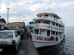 k日記ブラジル編 2000.7.11(火) 日本人の奥さんのトモエさんを持つガイド、クラウディアといっしょに港へ向かう。太陽がさんさんと照りつけるなか、たくさんの客船がビッチリ並び、忙しそうに荷物を積み下ろししていた。一体、ココに停まっているどの船に車を乗せるんだろう?車を乗せるような大きな船は見当たらなかった。 すると、クラウディア。何を思ったか、1艘のベレン行きの客船へ「船長はいるか?」小僧に聞いている。「ああ、中に入るよ。どうぞ」そう言って、客室の方を指差す。船長を探して船へ。船の中では、荷物を移動したりとたくさんの人があわただしく動いていた。その中の一人に声を掛けるクラウディア。「車を1台ベレンまで運んで欲しいんだが、いくらだい?」「え、車ですか?そりゃ、だめだよ。この間の事故から、車を乗せられなくなったんだ。警察も厳しくて」「そうか・・・ありがとう」そう言って船を降りた。この間の事件って?「ああ、この間な、船に2台だか3台の車を乗せた客船が、出航してすぐ転覆してしまったんだ。死人もでたしな」そうですか。と言う事で、オフィスに帰って一から探し直し。 電話帳片手に船会社に電話しまくるクラウディア。そして、コレが一番安かったと言ったのが、人込みで550ヘアル(約US275ドル)これは、安い。しかも、毎日あるという。じゃあ、青山さんが出発する木曜日に出発することにして、クラウディアにお礼を言って、恒例の生ビールに向う。そして、無事船が見つかったことにカンパーイ! |