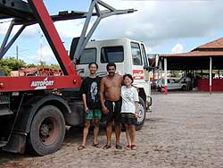 k日記ブラジル編 2000.7.17(月) 気持ち良く寝ているとガックンガックンとものすごい揺れが襲ってきた。どうやら、下船らしい。椅子の手摺に捕まり揺れに耐える。 ベレンの土は、赤かった。雨が時々降ってくる。ちょっと肌寒い。船の中でカーゴのオヤジに途中の分岐点まで乗せていって欲しいと下話をしてOKをもらっていたので遠慮なくカーゴに乗せていってもらうことにしたのだが、カーゴの中には3台の車が乗っていて、牛次郎はその真ん中にいるのでベレンで置いて行く車と入れ替えをなければいけなかった。カーゴから牛次郎を降ろす時がやってきた。 だが、エンジンがかからない。寒いせいかもしれない。船の中でアイドリング低かったしなぁ・・・みんなに手伝ってもらって前から無理やり押してカーゴから出す。そして、押し掛けに挑戦。行ったリ来たりするがなかなかエンジンはかからなかった。何回目かの押し掛けでやっとかかったが、何故か馬力が出なくカーゴの坂も登らない始末。半ば諦めが入っていたが「気合で乗せろ。途中までつれてってやるから」のオヤジの言葉に思いきりアクセルをふかしようやくカーゴに乗った。うめちんぐったり。雨は止み、空は、カラット晴れていた。 揺れるカーゴに今までになく揺れる牛次郎。ブレーキがかかるたびに鞭打ちになりそうなくらいのガックン。そんなのを繰り返していたら、タイヤを止めていたベルトが外れたらしくカーゴから落ちそうになる牛次郎。よく見れば、ベルトのフックを引っ掛けていたカーゴの床が、牛次郎の体重に耐えきれず、破損したためにベルトが外れたようだった。みんなで唖然。オヤジにすごく謝る。太っ腹なオヤジはただ笑うだけだった。 分岐地点のガソリンスタンドでカーゴのオヤジとお別れをする。とても、いいオヤジだったので、記念に写真をとカメラを出すとちょっと待てとトラックに戻り拭いても変わらないであろう褐色の顔をタオルで一生懸命拭いていた。 相変わらずエンジンの掛かりが悪く、調子の出ない牛次郎。やっとのことでガソリンを入れ、ぶすぶす黒い排気を出しながら出発するが、いかんせん馬力がでない。たぶん、うめちんのクサイ靴下がいけないんだろう、可愛そうな牛次郎。反抗してるんだわ・・・と思っていると「あ、もしかして」突然叫んで、牛次郎を路肩に寄せるうめちん。エンジンルームの蓋を開けて、ディストリビューターのコードを入れ替えている。「あれ?それって右回りに上から1、2、3、4の順だって言ってたじゃない?なんで入れ替えるのさ」「うーん、そうなんだけど、なんとなく3、4のコードが始めさ、逆についてたような気がして・・・」そして、キーをひねると・・・調子よく1回で掛かった。走り出して見ると、ちゃんと坂を登るじゃないですかぁ。なんだ、うめちんの勘違いだったのね。また、どこか壊れたのかと思ってヒヤヒヤしまった。とにかく走るようになってよかった。 それからは、調子よく走り出す。走っていたはずだが「なんか、変な音しない?」快調に飛ばしていたうめちんが言うので耳を澄ませてみると、カラカラ・・カラ・・ん?そう言えば変な音するねぇ、なんだろう?もっとよく耳を澄ませると、変な音は、下の方から聞こえて来る。なんか、タイヤの所から聞こえて来るヨ?路肩に車を寄せ見てみると、なんとキツク締めたはずのナットが数個、緩んでいた。こりゃ、いかん!急いで懇親の力をこめて締め直す。が、ちょっと走るとすぐまた緩んでしまう。 よくみりゃ、ホイールの穴が削れて大きくなっており、ナットで押さえ切れなくなっていた。古いホイールを使っているのでしょうがないが、これでは、いつタイヤがすっ飛んでいくかわからない。と言う事で、近くの修理工場で大きめのナットを探すが、見つからず、どうしようかと考えた結果、修理屋にあった座金をあてがって締め直す事にした。これは、なかなか調子が良かった。 でも、フォルタレーザまで約1600km。不安多い行程で、一体何時着くんだろうか? ブラジルの大地は広い。牧草地、沼地、ジャングル、どれを取っても広大だ。それにもましてどこまでも広い空が広がる。そのすべてが,夕暮れ時、絵に描いたような黄昏色に染まる。なんて美しいんだろう?心を奪われたように呆然と見つめ続けた。 道沿いのガソリンスタンドに宿を取る。南米の街中じゃないガソリンスタンドには、大きなトラックが停まれるように大きな広場があったり、必ずと言っていいほどトイレにシャワーがついていて、ただで貸してくれたりする。しかも、日本ではありえないビールやアルコール類がガソリンスタンド内の売店で売っていたりする。24時間営業の所も多く、いつでも冷たいビールが飲めるのだ。これは、私達、貧乏人にはありがたい。 と言う事で、取り合えずビール。一日、暑い中、運転をした後のキンキンに冷えたビールは格別に美味かった。こんなにビールが美味いと感じたのは久しぶ