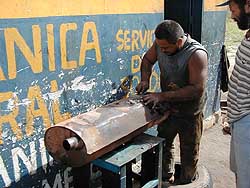 k日記ブラジル編 2000.7.21(金) ガソリンスタンド付属の修理工場でガソリンタンクを溶接してもらう。その間に車の点検をする。プラグを掃除して、オイルの点検。なぜか、なくならないはずのブレーキオイルが少し減っていた。この間、直したパッキンが磨耗して穴が開いたか?原因がわからない。でも、ブレーキの効きが確実に悪くなっている原因の1つだろうと思いつつも、原因が分らないのじゃ直しようがない。 取り合えず、ガソリンタンクが直ったので先ほど抜いたガソリンを入れて出発。相変わらず調子は悪い。ぶすぶす言って走らない。無理に走らせていたが、突然走らなくなった。本当に突然。 アクセルをいくら踏んでも進まない。ガス欠か?いや、そんなはずはない。計ってみるとちゃんとガソリンは入っていた。エンジンルームをいろいろ探ってみると、たまにガソリンフィルターにガソリンがやってこない時がある事を発見。 ガソリンチューブを外して、口でチュ-チュ-吸ってみる。すると、すーっとあがってくる。他の所からもチュ-チュ-吸ってみたが、ちゃんとあがってくる。もう一度、エンジンをかけてみると、ブルンとかかるが、やっぱりすぐ止まってしまう。どうしたもんかと思案に暮れる。ここで、牛次郎とお別れか?そう思ったが、取り合えず先ほど通過したガソリンスタンドまで何とかして戻る事に。 登り坂だったので、バックの押し掛けで走っては止まり、走っては止まりして、何とかガススタに到着。ガソリンスタンド付属の修理工場で見てもらう。車をみたオヤジ、何の事やら?と、どんな故障か理解していない様子。しょうがないので、オヤジを乗せて試運転に出かけ理解してもらうことに。 しばらく走るとブス・・と言って止まる。すぐに理解した様子のオヤジ。ガススタに戻ろうとバックの押し掛けで走って止まりを繰返す。何度目かの押し掛けで、突然、ビシャーっと天井に何かの液体が噴き出した。驚く。エンジンルームを見ると、ラジエーターから伸びているホースが、押し掛けの衝撃で切れていた。ああ、余計な所まで壊れてしまた・・・。そんなこんなで、故障を作ってガススタにようやく戻って来れた。 さっそく修理にかかるオヤジ。キャブが悪いと一生懸命キャブを分解している。そして、日が暮れるころ作業終了。試運転に出かける。お、今度は調子がいいようだ・・・と思っていると、ブスンと言って止まってしまった。 「ここまで、治しても止まっちゃうんじゃ、あとはもう、今日入れなおしたガソリンにゴミが混じっているのかもしれないよ。あした、入れなおしてもう一度試運転してみよう」そんな事をつぶやきながら、バックで押し掛けをしようするうめちん。と、当然、ブシューと言う音と共に「アチー!!」と叫んだ。 先ほど破裂して直したばかりのラジエーターホースがまた切れ、熱湯が噴き出し腕を少し火傷してしまった。ジョボジョボこぼれおちる熱湯。エンジンはかかるものの、今度はオーバーヒートで止まりそうだった。難を逃れてガススタに到着。 日も暮れたせいもあるが、お先が真っ暗な感じがして来た。ここで、牛次郎とお別れか・・・うーん、不安は隠し切れない。 |