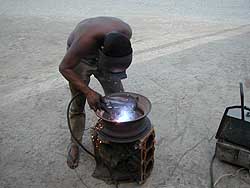k日記ブラジル編 2000.8.14(月) 破損したガソリンタンクを直すには、溶接が必要だった。溶接をするには、爆発する危険があるので、満タン状態のガソリンを全部抜いてしまわなくてはいけない。一度、タンクから抜いたガソリンをそのまま使おうとすると、ゴミが入っていたり、容器が溶け出して不純物が混じったりして、ろ過してから使わないと牛次郎が消化不良を起してしまう。悪ければ、二度と使えないガソリンになってしまう。では、これらをすべて回避するにはどうしたらいいか?考える・・・ ポクポクポクポクポク・・・チーン。答えは簡単。多少ガソリンを無駄にはすが、タンクが空になるまで走り、それからメカニックに行けばいいのだ。と言う事で、走る。 広い草原を走る牛次郎。タンクが軽くなるとガソリンの漏れも止まった。計算通りだと、ここまで走れるはずとうめちんが豪語する街に近づく。目の前にはガススタの看板が青空に聳え立っていた。「あの、ガススタで見てもらおう・・・」とアクセルを踏みこんだ瞬間、プスンと言って止まってしまった牛次郎。「もう少しなのにィ〜」と悔しそうに予備ガソリンを注入するうめちんだが、「だいぶ読みが当たってたじゃん」と猪飼さんに誉められたとたん、鼻ガ天狗になっていた。笑える。 ガススタの横のメカニックに乗りつけると、奥から、上半身裸の褐色のオヤジが出てきた。オヤジの胸の周りには、黒人さん特有のアフロ毛がポチンポチンと不自然に生えていて妙な感じ。自然とオヤジの胸毛に目がいってしまい、思わず吹き出しそうになってしまった。そんなオヤジに車の説明をするとテキパキと動きした。ガソリンタンクはすぐお湯で洗われ、溶接してもらった。クッションゴムも新しい物をつけてもらう。ついでに前輪のタイヤホイールがヒビ割れて、走ると変な音がしていたので、そこも溶接してもらい速攻直ってしまった。腕のイイメカニックに当たったようだ。 黄昏色の空を見上げると、大きな大きな白い月が天に昇ろうとしていた。次第に闇の世界が広がり、青白い光がすべての物を照らし出す。水面に映し出されたそれは綺麗だった。今夜は、満月か・・・いつまでも、いつまでも眺めていた。 |