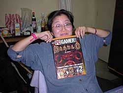 k日記ブラジル編 2000.9.4(月) うめちんがどうしても欲しいと言う、パソコン用のゲーム「ディアブロ」が、先日、南米でよく売っているゲームマガジンの付録として売り出されているのを発見。ちょっと値が張るが、買ってしまった。喜び勇んで毎日の様に遊んでいる。そんなの買って・・・そんなに面白いの?と思っていた私。ちょこっと暇になったのでやってみることに。 英語の解説だったので、うめちんから説明を受ける。何でも、剣士、ローグ(弓矢使い)、魔法使いの3種から自分の好きなものを選んで、ダンジョンに冒険に出して、襲って来る魔物をばったばったとやっつけて宝物を拾って帰って来る。たくさんダンジョンがあって、レベルが上がり強くなると、先に進め、たくさんのお宝を手にする事ができるという、アクションRPGらしい。では、早速画面に向かう。 ゲームを始めて数時間後、パソコンの前から離れられなくなってしまった。時間も忘れてマウスをクリックする。VAIOのマウスが馬鹿になるのでは?一瞬、そう思ったが、ほんの一瞬も気にしていられないくらいにゲームにドハマリしている自分がいた。 ハっと気がついた時には、私のキャラクターは、うめちんのキャラクターのレベルをはるかに上回ってレベル15にまでなっていた。苦労して倒していた小魔物も一太刀で倒れるくらいに強くなっていた。それもそのはず、時計を見れば夜中の3時。VAIOのマウスポインタに当てていた人差し指の先端に、鈍い痛みが走る。障ると豆ができていた。 どうしても欲しいと言っていたうめちんの気持ちが今日、やっと分かったような気がした。 |