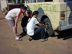 k日記ブラジル編 2000.9.18(月) きれいな高速道路が終わり、大きな川に掛かるダム橋を渡った町、トレスラゴスを過ぎた辺りで後ろタイヤの調子が悪くなる牛次郎。おい、まだ走り出して2日目だよ。早過ぎやしないか?と突っ込みをいれたくなる。 タイヤから発する音からして、ブレーキが引っかかっているのだろうと推測するうめちん。炎天下のガススタで、後ろタイヤをバラしてみると、案の定、油圧のシリンダーからブレーキピストンが出てこない。しかも、ブレーキパットを押さえているジが外れてちゃんと作動しなかったようだ。これでは・・・気温40度近くの炎天下の中、早速、修理に取りかかる。青山さんとうめちん。痩せ二人、干からびる寸前で応急処置終了。 シャワーを浴びて復活した後、近くの町のメカニックへ行ってみるが、見るからに胡散臭そうなメカニック。年のころ15、6の少年が出てきたので、ブレーキが壊れた旨を言うと、ハッサンと言うこれまた18、9の青年を呼んできた。ハッサン青年がタイヤを外し始めると、ラスタオヤジがやってきていっしょになって見ている。車に乗りこんできては、ブレーキを踏み踏みしている所をみるとこの人もメカニックらしかった。しかも、ハッサン青年がラスタオヤジの事を「マエストロ(先生)」と呼んでいた。「なんだか不思議な所だなぁ」なんて思っていたが、ブレーキは、引っかかったブレーキピストンをハンマーで叩いただけで作業終了。ちゃんと直してくれないので「直ってない」と金も払わずメカニックを後にする。 辺りは、真っ暗。道もいい状態とは言えない。ブレーキもあまり効きが良くないし・・・早くガススタへ。焦る気持ちと裏腹に牛の前ホイルがバコンバコンと大きな音で泣き始める。なんだなんだ?と路肩に停め、タイヤを見ると少しネジが緩んでいたらしく、締め直す。そして、走り出すが、音は消えない。これはいけないと真っ暗な路肩で、猛スピードで横を走りぬけるトラックにおののきながら、急いでスペアタイヤに交換する。ボコンボコン音がするホイールは、ネジ穴の所から縦に亀裂が入り、前に溶接で直したヒビとは別の個所にヒビが入っていた。もう限界だったのだろう。明日は、もっとまともなメカニックに行かないと・・・ちゃんとパンタナールに行けるんだろうか? |