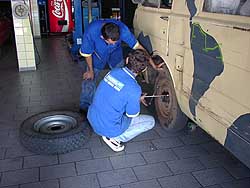 k日記ブラジル編 2000.9.19(火) 昨夜泊ったガススタの近くにまともそうなメカニックを発見。早速、直してもらおうと思ったのに、ここでもしっかりとは見てくれなかった。しょうがないので、ここのメカニックで道具を借りて自分達で直す事に。 何故かその場に居合わせた、暇人のトラッカーが手伝ってくれて、どうにかこうにか直ったので、トラッカーにビール一本とお礼を言ってメカニックを後にする。 ホイールの限界を知った私達。これから、未舗装の道路を走る事を考えるとスペアタイヤなしと言うのは、ちょっと心配。と言う事で、牛次郎に合う安いホイールがあればとカンポグランジで、一軒のタイヤ屋さんに入る。店員に事情を話すと、大きくうなずき、テキパキと処理をしてくれた。ホイール屋さんに片っ端から電話を掛け、牛に合う格安のホイールを探しだし、中古のタイヤもあれば欲しいのだがと言うと、店の奥から探し出してきてくれ、すぐに交換してくれた。作業を見ていると、店のオーナーらしき紳士がやってきて「君達は、あそこのVIPルームで待っていなさい。あそこは、クーラもあるしテレビ、ビデオもあるからね。そうそう、冷たい水もコーヒーも自由に飲んでイイからね」何とやさしいお言葉。 繁盛している店らしく次から次へとひっきりなしに車がやってくる。テキパキと作業をする人々を見ながら心地よいクーラー室でマッタリする。ああ、この上ない幸せ・・・ここで寝泊りできたら、ガススタより居心地イイような気がする。そんな気分を引き裂く様に牛次郎の作業は終了してしまった。うだるような暑さの中に放りだされた私。ニコニコ顔のうめちんを横目に唸る。 さあ、これで、問題なくパンタナールまでいけるかな?行けるといいなぁ・・・草原が広がる大地に真っ赤な夕日が沈む。夕陽を受けた白牛が、のんびりと草を食み、牛次郎の影も夕陽が沈むとともに長くなる。そして、すべてが黄昏色に染まる。ブラジルの大地は広い・・・闇の訪れ。 閑散としたガススタに入ると同時に、ブレーキが効かなくなった。たぶん、後ろタイヤのブレーキだろうと見当を付けただけで、明日直すことに。ああ、今日も疲れたなぁ。本当にパンタナールにいけるんだろうか?疑問は募るばかりだった。 |