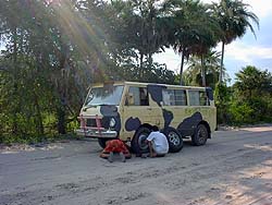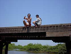 k日記ブラジル編 2000.9.21(木) コルンバから、パンタナール湿原へ。幹線を逸れて雨季になるとなくなってしまうと言う未舗装道路を走る。赤茶けた土埃をモウモウと揚げ走る牛次郎。 入ってすぐに「パンタナール、ミラドール」と書いた見晴台があるが何も見えそうにない。どんどん奥に走っていく。数時間走った頃、木の橋があらあわれる。橋にさしかかると、湿原らしい風景が広がっていた。照りつける太陽に緑がキラキラ輝き、そよ風に揺られ、静かにたたずむ水面を跳ねる魚達。虫の鳴き声がこだまし、鳥達が警戒なく飛びまわる。車を降りのほほんと橋に座り込み、その場に同化する。心地よく、気持ちがイイ。釣りをしたり、しばらくそこで遊んで先に進む。それからは、綺麗な風景がどこまでも続いていた。ある橋池では、ワニが数匹のほほんと水浴びをし、私達が近寄ってもホエーとしたまま動かない。石を投げても気がつきもしない。はたまた、大きなねずみみたいな動物がのそのそと道を横切ったり、鳥が大きな羽をいっぱいに伸ばしゆうゆうと空を飛びまわる。ここは自然の宝庫なのだと実感した。 感動しきりもつかの間、牛次郎がパンクした。やはりと言うか予想通りと言うか・・・そんなに大きなパンクではないので、空気が抜けきるまで走ろうと自然を満喫しながら走る走る。途中、艀に乗る所までは良かった。 艀を渡ってから、ワニの数も鳥の数も動物の数も増えてきた。探さなくても見える動物達。感動大である。でも、その感動が、恐怖に変わる。突然、牛次郎のクラッチが効かなくなったのだ。クラッチオイルを見ると空になっていた。オイルを足してみるが、一向に直らない。たぶんどこか破損していて漏れているのだろうと推測は付くには付くが、こんなパンタナール湿原の真ん中では・・・クラッチなしでどうやって走るの?今度こそ、牛次郎の御冥福をお祈りか?と思ったが、こんなとき頼りになるバイカー青山さん。クラッチなしで無理やりギアをいれ走り出す。これで、メカニックまで行くしかない!!自然を満喫している場合ではなくなった。止まりません様にと祈る。 真っ赤な夕陽がパンタナールに沈む。綺麗だった。でも、停まる事はできない牛次郎は、走り続けるしかないのに、先ほどパンクしたタイヤを交換しなければならず停まり、舗装路に出たとたんに検問に引っかかる。運が悪い。無理やりギアを入れるたびに叫び声をあげるギアにエンジンがガンと揺れる。その度に心が痛い。ギアが壊れたら、本当に御冥福を祈らなければいけなくなる。何とかもってくれ。 祈る気持ちでやっと見つけたメカニックは、クラッチが壊れた場所から200kmほどのミランダと言う町の入り口にあった。疲れ果てる。修理は明日と言うので今日は、ここに宿を取ることに。クラッチなしでずっと走り続けた青山さん、本当にご苦労様でした。 |