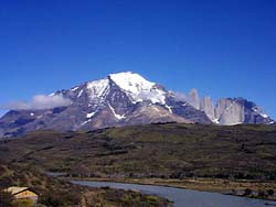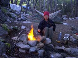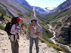 k日記チリ編 2000.1.14(金) 夢の中でドアをノックする音がした。取り合えず「はい」と答えるまでは覚えているが、その先は記憶がない。ふと、目覚めたときには7時40分をゆうに越えていた。ああ、ドアをノックしたのは夢じゃなかったのね。と、思っている暇も無く、急いで支度をしてバスに飛び乗り、シートに座ったと同時に眠ってしまった。本当に朝に弱い二人である。 牧場のような草原の砂利道を走っていた。パイネ国立公園のゲートが見えてくると突然、道路ッ際に鹿みたいな動物の群れが目に飛び込んでくる。しかも、バスが走ってきてものんびりと草を食んでいる。あれは・・・この辺で有名なグアナコと言う動物だと後で知った。この辺は野生の動物の宝庫らしくいろんな動物がみれるのだそうだ。 ゲートをくぐると今度は、人がたくさん群がっていた。レンジャーがバスに乗りこんで来て公園内の事を少し説明した後、入場料を払いにバスを降りる。バスのドアが開いた途端冷たい風がゆるゆると吹いていたが、陽射しが強いのでほかほか暖かい。ポケットから入場料を払ったらほとんどのペソが無くなっていた。暖かいのは、陽射しだけ・・・後は、寒いものばっかりだ。 宿で買ったチケットは、公園内の3箇所(RagunaAmargaとLagoPehoeとGuarderia)で止まることになっているらしく、3箇所の何処からでもトレッキングを開始出きるし終わることも出来る往復チケット制になっている。私達は、入場料を払った管理事務所(RagunaAmarga)から出発する事に決めていたので、入場料を払った後、そのままバスを見送った。そして、重い荷物を担ぎ本格的なトレッキングをした事の無い私達のトレッキングが始まったのである。 RagunaAmargaで荷物の点検と準備をしているとバスに乗っていたオジさんがそそそーとやってきて「お前らトレックか?」と聞いてきた。はて?何を聞いてるんだこのオジさんと首をかしげていると「FantasticoSur(リゾートホテル)まで車で行かないか?そこまで歩くと2時間はかかるぞ。どうする?」ん?地図を見ると確かに道が実線で太く書いてあり道沿いに小さく「2.5h」と書いてある。「2.5時間歩くのか・・・うーん」といきなり考えてしまった。なんてダメなトレッカーなのだろうと思ったが「タダか?」と聞いて「一人1500ペソ!とっても安いよ!!」と言う言葉を聞いた途端、歩きたくなった。ダメトレッカーを撤回しいきなりゲンキンな優良トレッカーに変身した。 そんなこんなで車も走れる、ある程度広い砂利道を歩き始める。何処までも草原が広がる道端には、グアナコが群がり、歩いている私達なんかお構いなしで草を食んでいる。風が湖の水面を掻き立て草がさらさらと音を立てて私達を迎えてくれる。そんな風景がまじかで見れた。心が和む。 そんな気分に浸っているのもつかの間、歩き始めて3分、うめちんが「腹減った、朝ご飯にしよう」という言葉で一気に崩れ去った。道をそれ、グアナコの群れがいる草原へ足を踏み入れグアナコといっしょに朝ご飯を食べることにする。グアナコがいるためか、他のトレッカーがこちらを見ては手を振って去って行く。パンを食べ、少しお腹が脹れると暖かい陽射しが襲ってきて体を温めてくれる。そうなると一気に歩く気力が萎えてくる。ダメトレッカーの本領発揮。ぽかぽかのまどろみの中で美しい風景を見ながらしばらくボーっとしてしまった。このまま帰りのバスに乗っちゃおうかぁ・・・とまで思ってしまったくらいだ。 冷たい風が頬にあたり、まどろみの中から引きずりだされた。そうだ、ここにはグレイ氷河(GlagiarGrey)を見に来たんだよ。歩こう!!ととぼとぼのろのろ歩きはじめた。そして、30分ほど歩いただろうか?踵がなんとなく痛い。休憩がてら、見てみると靴下の踵がすれて破れてしまって赤くなっていた。新しい靴下を出すには、荷物を全部ひっくり返さないといけないし、どうしようと思っていたら、「昨日履いていた奴だけど」と、うめちんが靴下を貸してくれた。ありがたく借りたが、臭いのが移りそうなので穴の開いた靴下の上に履くことにした。「うめちんの臭いのが移ったら私、生きていけないし、靴脱いだ途端、廻りの人間も直ぐ即死だよねぇ」なんて冗談を飛ばしながら、快調に歩き始めた。冗談を飛ばせるほど、まだまだ余裕があった。 自然と「アルプスの少女ハイジ」の歌が口から出てくるような風景が何処までも続いた。そして、FantasticoSurが見えてくると同時にパイネの氷河を頂いた険しい山々が徐々に大きく私達の前に現れた。途中の川で汲んだミネラルウォーターを飲みながらしばらく眺めていた。 FantasticoSurを横切り、このホテルから約2時間の所にあるRefugioChileno(避難小屋チレーノ)に向う。今日は、そこのキャンプサイトで泊まる予定。木が生茂った涼しい道を歩いていると、向こうから見知った顔がてくてく歩いてくる。あーー、こんなところで合えるなんてーーと大きく手を振っていると向こうも気付いたら