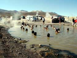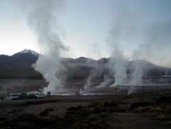 k日記チリ編 2000.2.19(土) 朝三時、まだ月の光が青白く暗闇を照らしていた。そして、私達も動き出す。いつもネボスケの私達が、こんなに早くに起きたのには訳がある。ここの名物、タティオ間欠泉のツアーに参加するためだった。 4時にホテルの前で陰った月の変わりに輝く、幾万の星を眺めながらボーっと待つ。ワゴンが1台、そして1台とやってきて、客を拾っては静かに去って行く。そして私達もやってきたワゴンに乗りこみ、暗闇の中を走り出す。さすがに眠く、いつしか眠りこけてしまった。 デコンボコンと椅子に頭を打ちうっすらと目が覚める。しばらく辺りを見回すが、どうもでこぼこの山道を登っているらしかった。振動がからだ中を駆け巡りなんだか、気分まで悪くなってきた。少し、頭痛もする。はて?車に酔ったかな?朝早く起きたし・・・空腹で車に乗ったからかなぁ?これは、眠るのが一番とまたまた眠りに入ろうとがんばったが気分が悪いのは治らなかった。 そうこうしているうちに、広い広場らしき所に到着。窓が曇っていてよく見えないが、相当、寒のだろう。窓を拭いても拭いても外が見えない。ワゴンを降りて思わず「うわーー」と叫んでしまった。うめちんは、突然駆け出して行ってしまった。かなり、広大な平地にたくさんの煙がもうもうと湧き上がっている。耳を澄ますと「ゴボ、ボコ、ボコ」と奇怪な音が聞こえてくる。気分の悪いのも忘れて、音のする方へ煙が立ち上る方へ駈け寄ると、勢いよく水柱が地上から噴出していた。感動!!の一言。辺りは、鉱物の臭いが漂っている。その廻りの水溜まりに手を入れて見る。ヒーと言ってすぐ手を引っ込めるうめちん。相当、熱かったらしい。私も触って見るたが、同じ結果だった。おおはしゃぎのうめちんと気分が悪いのを思い出してうめちんについて行くのがやっとの私。さんざん間欠泉を見て帰ってくると、朝ご飯の用意が出来ていた。なんと、間欠泉の穴に直接牛乳を放りこんで暖めていた。それと同じく固めの温泉卵も作っていた。 辺りが明るくなり、雪をかぶった山々が朝焼けで真っ赤に染まる。そして、勢いよく噴出す間欠泉を眺めながらの朝食は格別だった。ん?雪山?なんで、雪かぶってんのさ?ここ、砂漠の真ん中じゃないの?不思議に思う。そういえば、来るとき山道登ってたなぁなんて思い出し、ガイドに「ここ、山の上?標高高いの」と聞いて見ると「そうだ、山の上だ。標高は、クワトロミル・トレシエントmだ」「・・・えーええーここそんなに高いの?4300mだってぇ〜」突然、頭が痛くなるうめちん。あんなに走りまわって高山病に犯されたんだろう。書く言う私も相当気分が悪く、少し頭も痛かった。 朝食後、ワゴンに乗りこみ近くの温泉へ。標高4300mの温泉は、茶色の汚い水に底はヘドロとなんとも気持ちが悪いものだった。おまけに源泉が流れてくるところ以外は寒くて漬かっていられず、足も届かないほど深かった。熱い所まで泳いで行くのに相当息が切れる。そんなのは標高4300mだから当たり前じゃないかと思われるが、一生懸命泳がないと沈んでしまう。必死で泳いだ末、荒い息使いに更に頭が痛くなった。温泉好きの二人は、そんな温泉でも温泉は温泉と源泉の熱い所に陣を取り温泉を堪能。たくさんの人が入っていたが、お風呂に入る習慣のない人々は熱いところへ寄ってこない。入浴の習慣のあるドイツ人と私達だけが熱いところで奇異な目で見られながらジッと漬かっていた。温泉を堪能して、帰途に着く。山を降りるにしたがって、気分の悪いのも、頭が痛いのも次第に薄らいで行く。不思議だなぁと思った。 木々の木陰でお昼を食べて、お昼寝。風がそよそよと気持ちがいい。 夕方、月の谷ツアーに参加する。風化や雨水の浸食で出来た奇岩地帯を廻るものだ。死の谷は、赤茶けた奇岩と砂丘が混在したなんとも奇妙な場所であった。月の谷では、侵食によって出来た洞窟を歩き、塩でデコレーションが施された奇岩を登った。その後、潮の海の一本道を走る。一面塩、塩、塩360度塩の大地。そして、月の谷を一望できる砂丘を日没を見ながら歩く。幻想的な世界が展開される。人を寄せ付けない大地がここにはあった。 人間とは、なんとちっぽけなものだろうか・・・ |