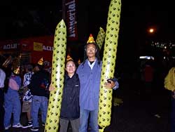 k日記コスタリカ編 99.12.31(金) 1999年も今日を最後に終り、あと何時間後には2000年がやってくる。そんな記念すべき日は、日本にそっくりなネイチャーランド、コスタリカで向えようとは去年の今ごろは思っても見なかった。 街の至る所で花火が売っていた。ここも他の中米と同じく新年になるにつれて花火三昧だと思ったうめちんは当然、即、購入。コスタリカンといっしょに遊ぶんだーーとコスタリカンの前で突然花火を出して驚かすんだとばかりにポケットに花火を忍ばせ、一人で楽しそうな顔をしていた。 日が暮れるにつれて街中に続々と人が集まってくる。警官や軍隊の警備員も増えてくる。メインの通りはビール会社に買収されたのか、ビール販売のブースと宣伝ステージが100mごとに設営され、すでに通行止めになっていて通りの終わりに道いっぱいのステージを作っていた。他の広場ににも仮設ステージや客席などを作っていてお祭りムード60%といった感じだった。 日本は、一足早く新年を迎えている頃と思い、500コロン(1ドル位)の電話カードを2枚買い、お互いの実家に電話をして見た。そんなに話せないよねなんて思っていたが3分経っても電話は切れず、ゆうに5分はしゃべれた感じだった。1ドルで5分も国際電話がかけられるなんてコスタリカっていいところだなとゲンキンな二人であった。 一旦、ホテルに帰り、明日ゆっくり出きるように荷物の整理をする。だいぶ荷物が増えたもんだと思いながら、小さいゴミやビンに入っている調味料をプラのジュース容器に移したりと100gでも荷物を減らそう運動をするが、テントの2kgが増えたのでそんなのは無駄だったと後で気がついた。結局、荷物は重いままなのである。 夜8時過ぎ、街へ。めずらしくバーガーキングなるものに入って贅沢な夕飯を食べる。そんな贅沢してイイのか?と二人でそうとう悩んだのだが、コンロの燃料が街中で買えなく自炊が出来ないし、他の食堂はもう何処も閉まっている。それに、お腹が空いたのにはかなわなく、一大決心してバーガーキングに入ってしまった。ファーストフードもいつも食べてると飽きてしまうが、たまに食べると本当に美味しいものだと思ってしまう。私達の感覚では、中米のファーストフードは高価な食べ物の部類に入ると頭にインプットされているので後の事を考えるとナカナカ足を踏み入れることが出来ないのだ。 腹が満たされ、店を出ると目の前の広場でコスタリカ版小田和正らしきコンサートをやっていた。私達は知らないが有名な人らしくテレビ中継とかもやっている。しばらく聞いていたが、すぐ飽きてしまった。その後にやってきたチンドンやと大型人形の芸人の方がよっぽど楽しくウケてしまった。 その後、ビール会社の買収道路に突入。ビール模様がしこたま書かれたビニール風船をゲット。うめちんが膨らましてるうちに競争率の高い三角帽子も人ごみにまぎれてゲットする。そして、給料も出ないのにビール屋の宣伝マンに変身。周りにも無給の宣伝マンがたくさん登場していた。 しばらく、ビールの宣伝ブースを冷やかして歩く。そして、片手にビニールふー船、片手にビールを引っさげ通りの端の大きなステージに向う。99ヒット曲コンサートをいいノリでやっていた。みんな踊り狂っている。ここのコンサートでカウントダウンは面白そうだと前の方へ進むがとてもじゃないけど人がいっぱいで進めない。これ以上限界と言うところでいっしょにリズムをとりながら楽しむ。 うめちんが花火をやりたいと言い出すが、肝心の火が無い。こんな人ごみでやったら迷惑だって言い聞かせて、その場は納得させる。そういえば、誰も花火やってないなぁとリズムに乗っていると、横にいた人達が突然スーッといなくなったと言うか後ずさりしている。なに?と少し空いた空間を見下ろすと、小型の缶コーヒー位の白い筒が転がっていた。よく見ると、黒い紐の先から火がチロチロと白い筒に向って進んでいた。ハッと気がつきうめちんを思いっきり押して横に逃げ、白い筒を背にした瞬間、ボンと大きな音と共に足に思いっきり何かが当たった。 耳がヒーンといって足元が安定しない。くらくらと酒の飲みすぎみたいにうめちんにつかまってないと立っていいられない。と、目の前を禿げたすご顔の強そうなお兄さんが2、3人人ごみの中からやってきて花火を投げた、若いお兄さん2人を羽交い締めにして連れて行ってしまった。そんな一部始終をあ然と見ていた私達は「うめちん、花火やらなくてよかったね」と心を撫で下ろしたのでした。せっかく買った花火はポケットの肥やしになりはててしまったが、捕まってしまっては事も子も無い。でも、禁止だったらなんで花火売ってたんだろうか?と疑問に思う二人であった。 カウントダウン5分前、ステージと客は盛り上がり、当然私達も盛りあがる。そして、「Tres、Dos、Uno、Feriz、Ano(3.2.1、HappyNewYear)」パン、パン、パン、パン・・・左右のビル