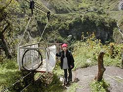 k日記エクアドル編 2000.5.22(月) 昨日に引き続き、エクアドルに来たら、バーニョへ行ったらいいと思う。いや、行った方がいいの方が正解かもしれないほどいい所だった。何がいいって、バーニョには知られざる、たくさんの自然とアクティビティがあるんです。今、バーニョは近くの火山爆発で、外務省が出す渡航自粛レベル3に指定されていて、たまにゴー−と音がしたり夜になると山が赤く火を吹くのが分かるほど火山爆発を近くで見れるんですよ。火山見学ナイトツアーなんてのも出てたりして。それからココには、川がたくさんあって、その先に大きな滝が4つあり、どれもこれも大きく壮大だった。特に、悪魔の風呂桶と呼ばれる滝は、一番大きく水飛沫を盛大に上げて滝壷が見えないくらい壮大でした。川では、ちょっと値段が張るが、ラフティングやカヤックもできるそうだ。 バーニョの近くにプヨと言う村が有る。そこへの道すがらに、とてもすばらしい乗り物を発見した。それは、高さゆうに200mはあろう渓谷にかかったロープウェイ。しかも、バスのエンジンを使った地元民お手製の代物。ゴンドラは、畳1帖ほどの床に厚さ2cm×幅2.5cmの木が敷いてあり、高さ1m程の鉄の枠網の手摺が四方を囲んでいるだけのもの。動き始めが落ちるような感じでむちゃくちゃ恐ろしく感じ、上下を2本のワイヤーで固定してあるのでそんなに揺れないが、途中までは、ゴンドラの重みを利用して動かしているので、途中でエンジンに切り返るときに一瞬止まると恐ろしい。風が吹けばさらに恐ろしい。でも、でも、自然を眺めるには最高の場所だと思った。 バーニョから少し行くともうそこはアマゾンジャングルだし、ここは、温泉だけではなく、自然がいっぱいなのだ。バーニョからキトまで4時間、気候もキトより暖かく過ごしやすい感じがした。だから、エクアドルに来たら知られざる大自然がたくさんあるバーニョへ行ってみるといいと思うよ。 |