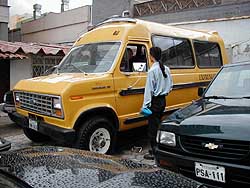 k日記エクアドル編 2000.5.31(水) 今日も朝から車屋巡り。昨日、さんざん歩きまわったおかげでちょっと足が筋肉痛気味だが、がんばって歩く。数件目の車屋さんで、程度のいい韓国製のkバンを発見。値段を聞くと6000USドル(約63万円)。ちょっと高いが、試乗させてもらう事に。店の回りをぐるっと一周。なかなかと言う青山さん。取り合えずまた来ると言って車屋さんを出る。 今日は、このへんで車屋回りを止め、ショッピングセンター「セーセーイ−」に行こうとバスに乗る。車窓をぼんやり見ている、なんとなく車屋を探す目に、1つの車屋の一台に目が止まる。あーと叫び指を差し、うめちんの肩をたたき、見て見てと顔を窓に持ってくる。そして、バスを停め飛び降り、車屋へ。それは、店の位置奥にちょこんと停まっていた。黄色い車体に、赤のストップマーク、ボンネット型のかわいい小型スクールバス・・・。なんとなく運命的なものを感じた。 店の人が出てくる。「これは、一体いくら?」と聞くと「5300USドル(約55万円)」ム、ム、ム、安いかも・・・ほッ欲しい!!スクールバスで南米一周だなんて夢みたいだ。これぞ、マジックバスだよ!!3人の顔がほころぶ。エンジンをかけてくれという私達の希望に快く答えてくれた店員だったが、なかなかかからないエンジンにちょっと不安になり、やっとかかったエンジンはアイドリング中に切れてしまうと言う、相当不安が残るぼろい品物だった。 「いや、いまバッテリーがないし、ガソリンもないから、かからないんだよ」と言うので「明日、までに走れるようになる?そしたら、試乗させて欲しいんだけど、いい?」「もちろんだよ、何時に来る?」「じゃあ、2時に来るから」と店を出る。 宿に帰って、その話をすると、あれやこれやまた夢が膨らんだ。でも、ホテルスクレの従業員カルロスにその話をすると「そんな燃費の悪い車、止めた方がいい」と言うばかり。悩む私達。夢を選ぶかガソリン代をとるか・・・両方かなえられないものか?どうしよう? |