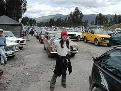 k日記エクアドル編 2000.6.3(土) キト最大の車市へ、バスで出かける。 大きな幹線道路から横にそれた砂利道に続々と車が入っていく。車にまぎれて砂利道に入る私達。アヤ−開いた口がふさがらないほどの車の量に一瞬戸惑う。これってどうやって車買うだろう?取り合えず持ち主に値段聞こうと目に付いた車に乗っていたオジさんに「これいくら?」と聞いてみると値段を言ってくる。なあんだ、値段を聞いて値下げ交渉すればいいんだぁ。ちょっと、安心。 さらに奥に進む。進むにつれて車の数が増えてくる。そして、行きついた先は、ちょっとしたT字路にぎっしり車が並びそのT字路を中心に両側の道路いっぱいに車が並んだ空間だった。一体、ココには何台車あるんだろう?数百台?数千台?全部売り物か?なんだか、車を見る前から疲れてしまった。 取りあえず、大型のワゴン中心に値段を聞いて、エンジンの調子や燃費について聞いてみる。どれもこれも調子の良い事をいい張り、めちゃくちゃ高い値段を言っているような気がしてならない。 そんなに調子良いんだったら、ボンネットを開けてエンジンの調子みせてもらおうじゃないかぁ。と、ボンネットを覗くとあれまぁ、キャブの上についているエアクリーナーがなかったり、錆びだらけで真茶色だったり、アイドリングが低いならイイがなんだか今にも止りそうな音だったりとボロさ見え見え。でも、新車のように綺麗なものもある・・・でも、こういうのは、いくら言っても高い値段から下がらないが・・・よく見ないと変な車を掴まされてしまう。と言ってもこんなにあったらなぁ・・・考えるだけで疲れてしまったが、車欲しさにでくでく車の間を歩き回る。 1往復・・・途中・・・あれ?さっきこの車向こうにいなかったっけ?あーあいつら移動しまくっているぅーーー。さっき値段を聞いた車にまた値段を聞いてしまった。お願いだからその場に停まっていてくださいと懇願。二度手間に更にどっと疲れる。 そんなこんなで、目をつけた車に唾をつけただけで、ものすごい疲労感と共に帰途につく。ああ、疲れた・・・本当に車、買うんだろうか?いや、あの車市で買えるんだろうか? |